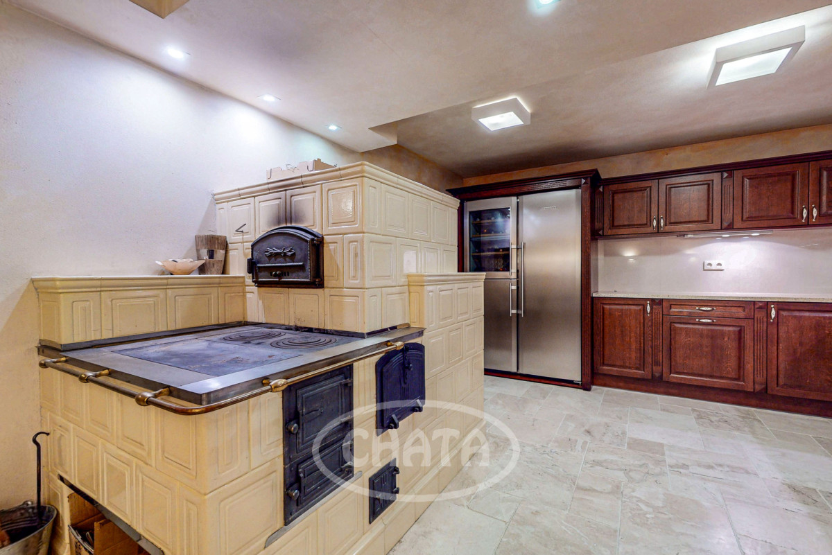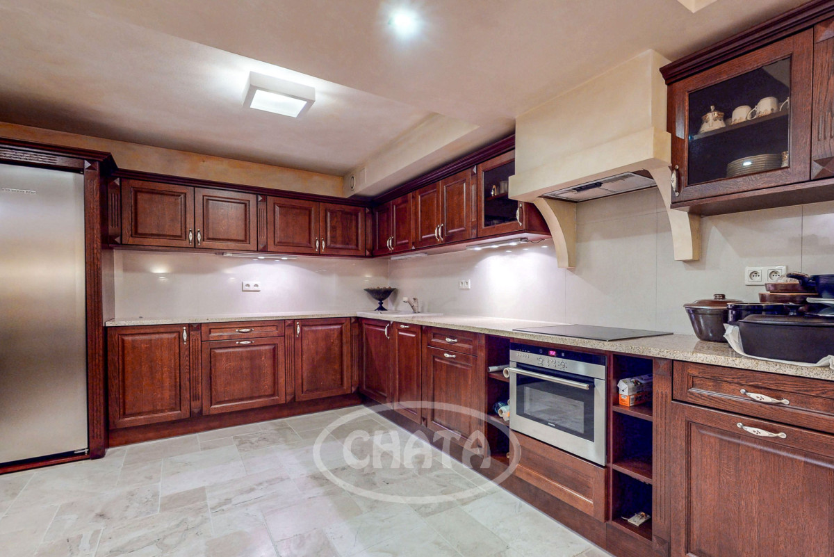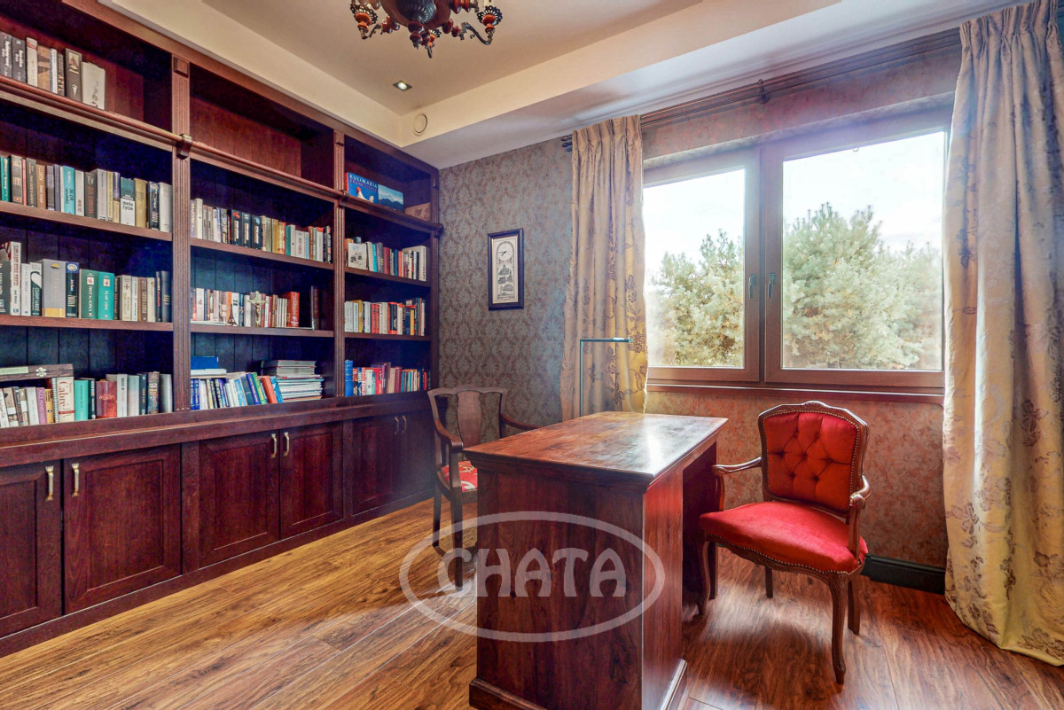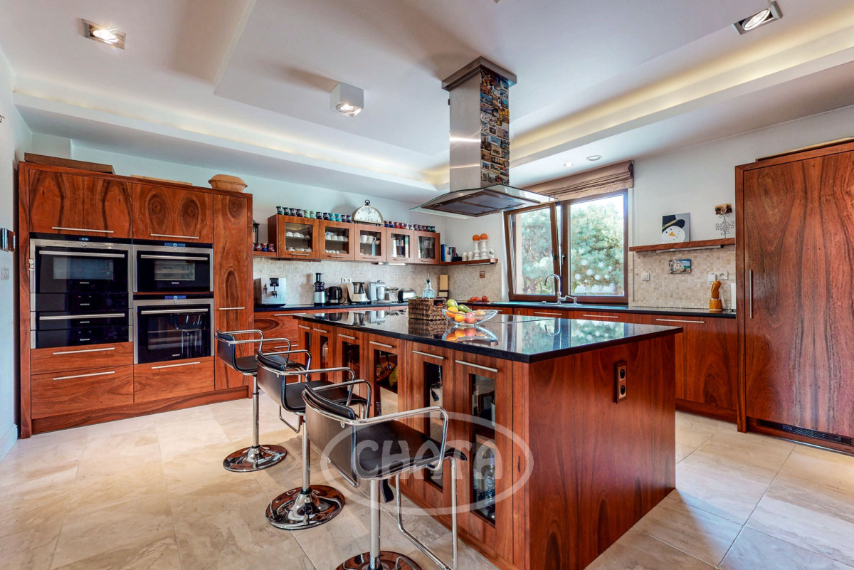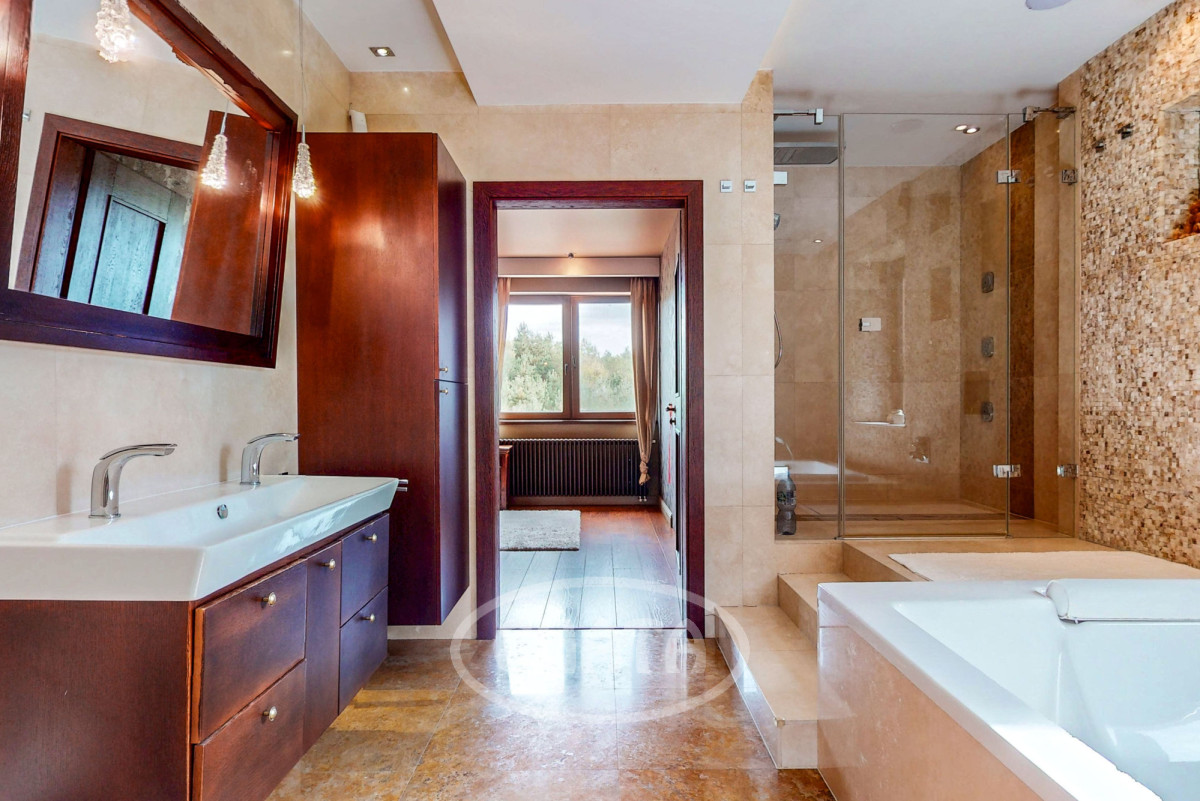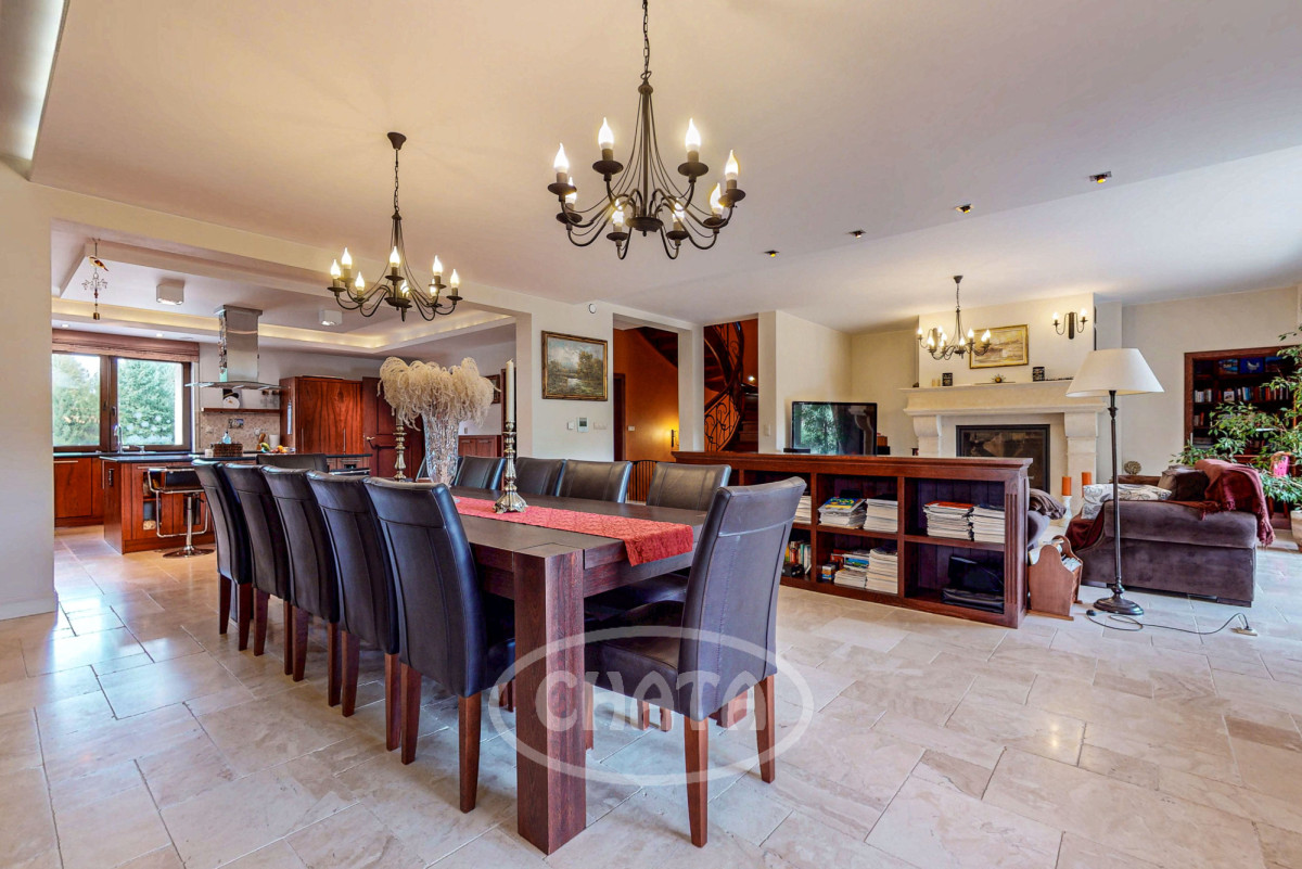 jednocześnie zachować dużą przestrzeń. Z obu stref wyjścia na tarasy. Obok salonu stylowy gabinet. Duża kuchnia zabudowana eleganckimi meblami z drewna z gruszy wykończonymi blatami z czarnego granitu z wyspą. Dodatkowo toaleta oraz siłownia. Podłogi na parterze wyłożone kamieniem z ogrzewaniem podłogowym.