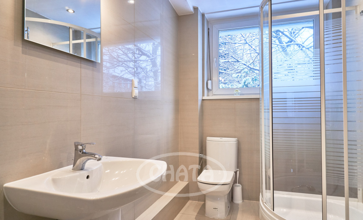 Piętro: 3 pokoje, łazienka wc- z wanną, bidet, okno.