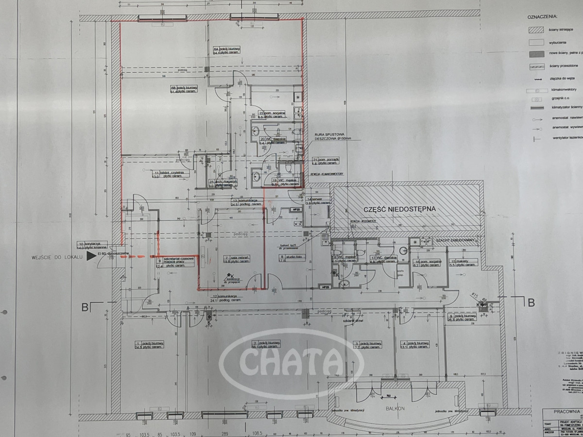 Modern office space of 160 m² available for rent in the prestigious Rondo Verona building at Powstańców Śląskich Street, Wrocław. The office is located on the 1st floor, accessible by elevator or stairs - fully barrier-free (the area marked in red on the plan).