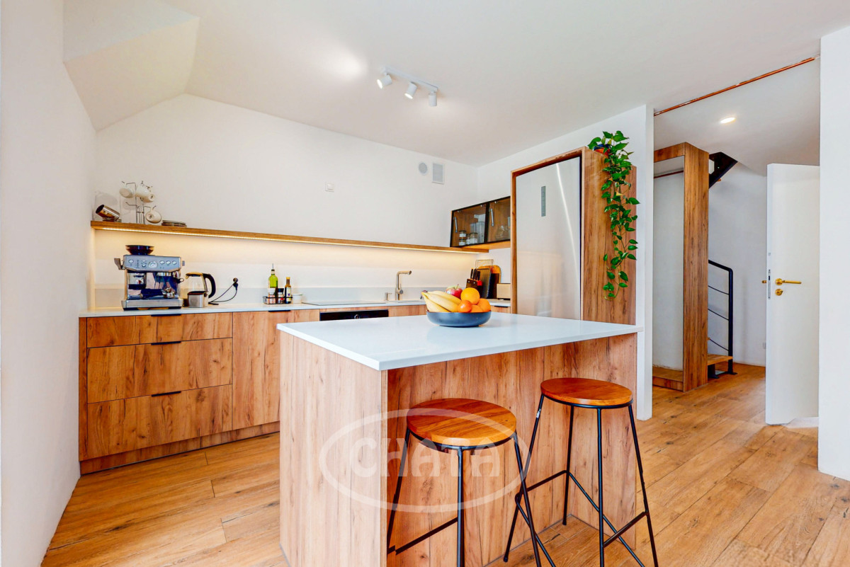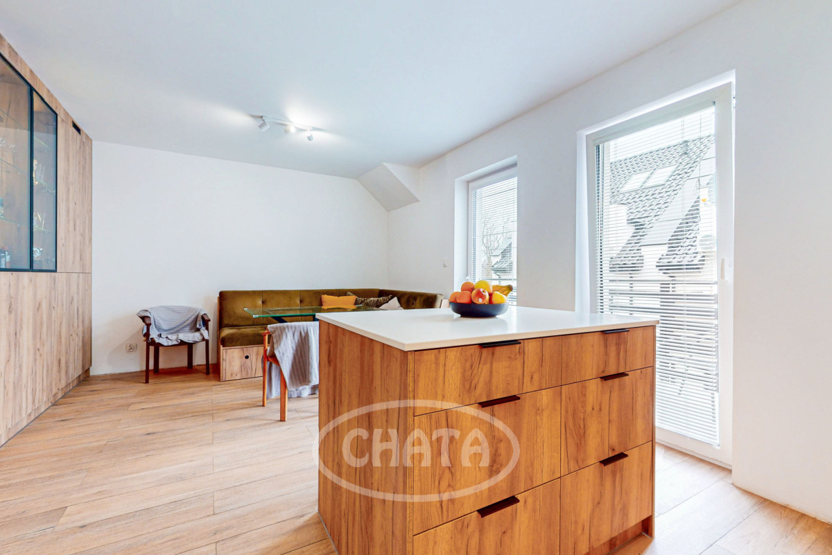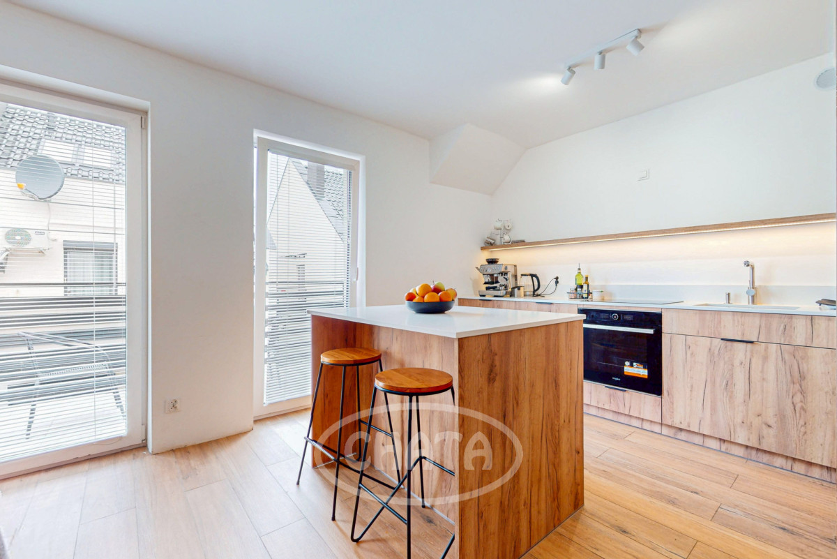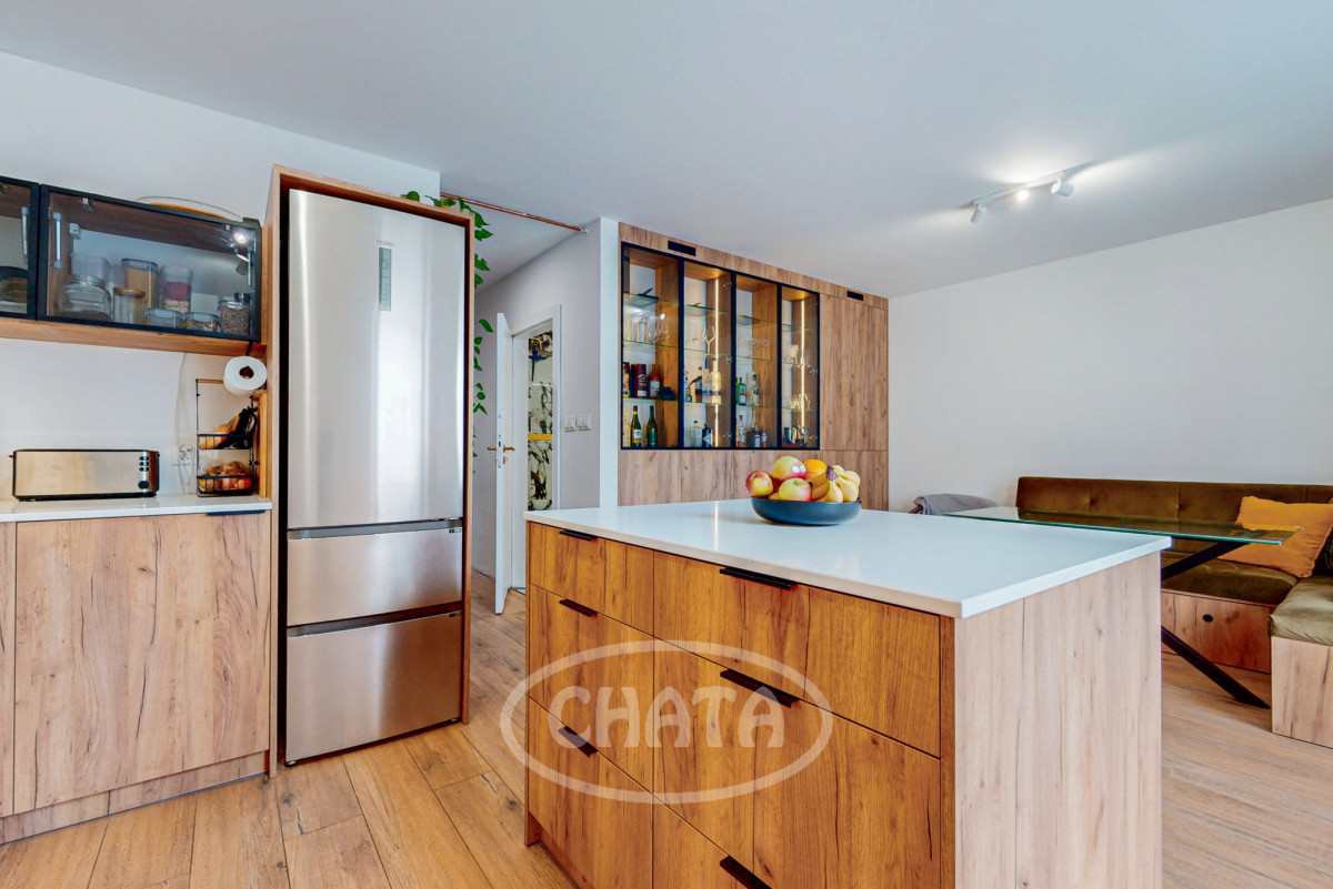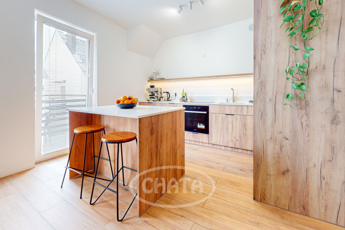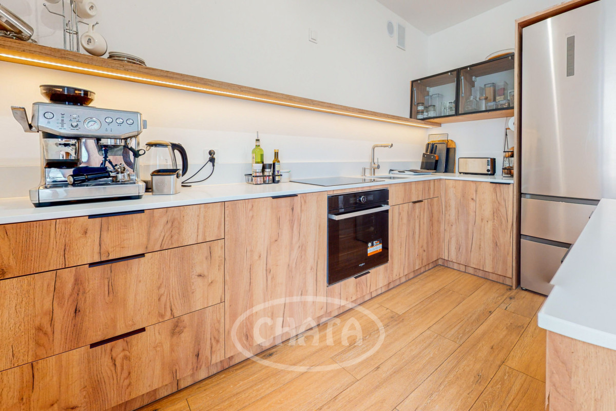 - kuchnię w kolorze drewna, która łączy naturalny wygląd z nowoczesnym designem. Kuchnia wyposażona jest w funkcjonalną wyspę, efektowne regały oraz markowy sprzęt AGD (lodówkę, piekarnik, płytę indukcyjną, zmywarkę) zapewniając wygodę w codziennym użytkowaniu.
