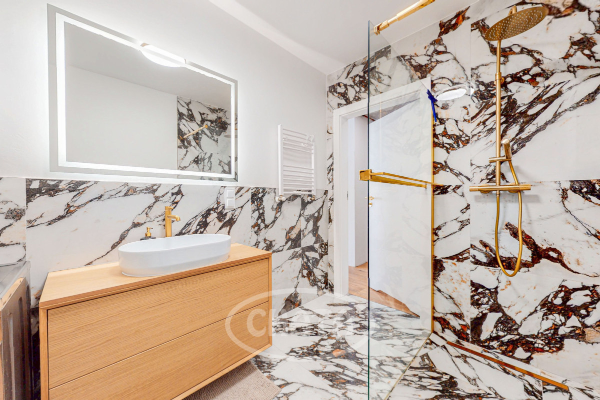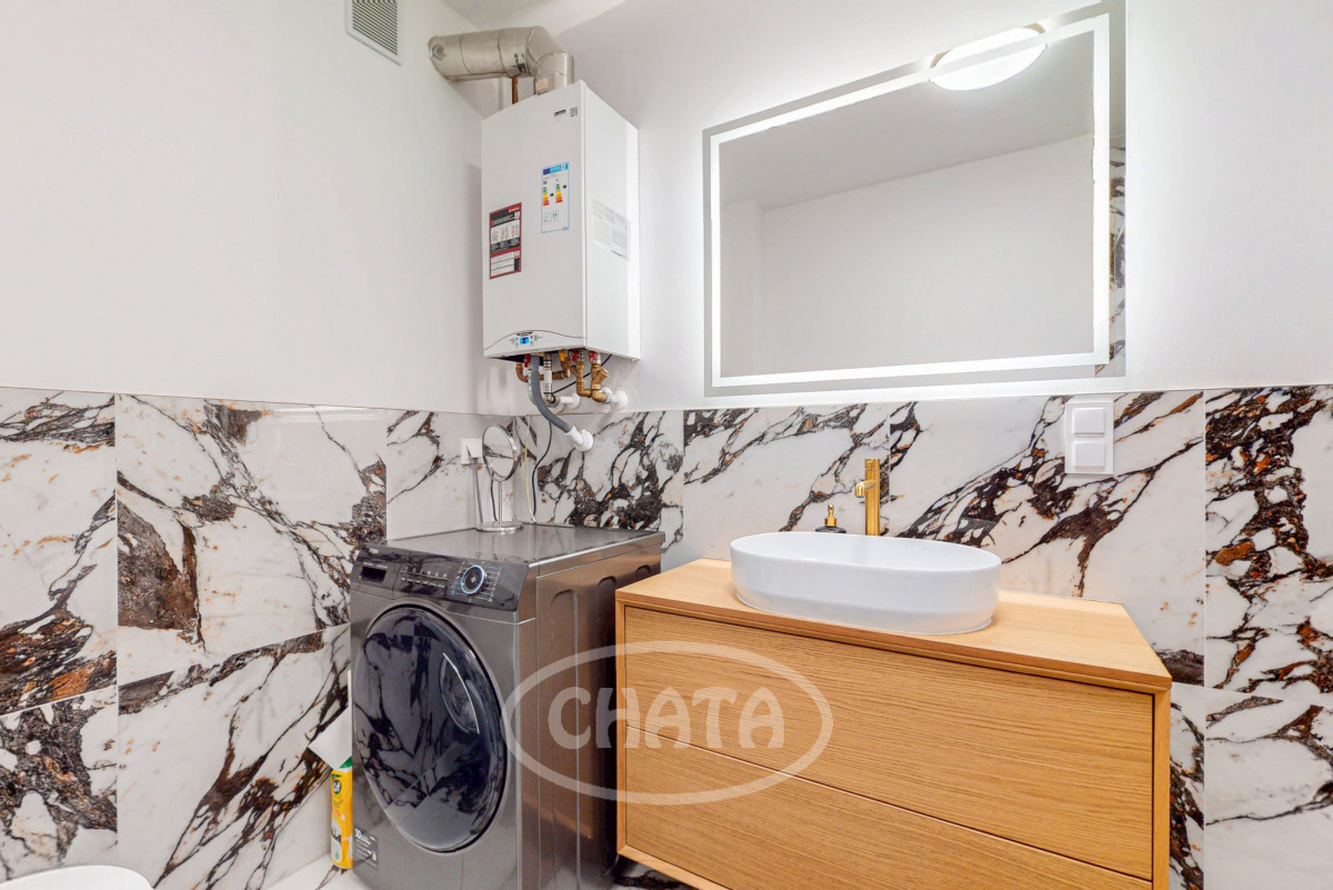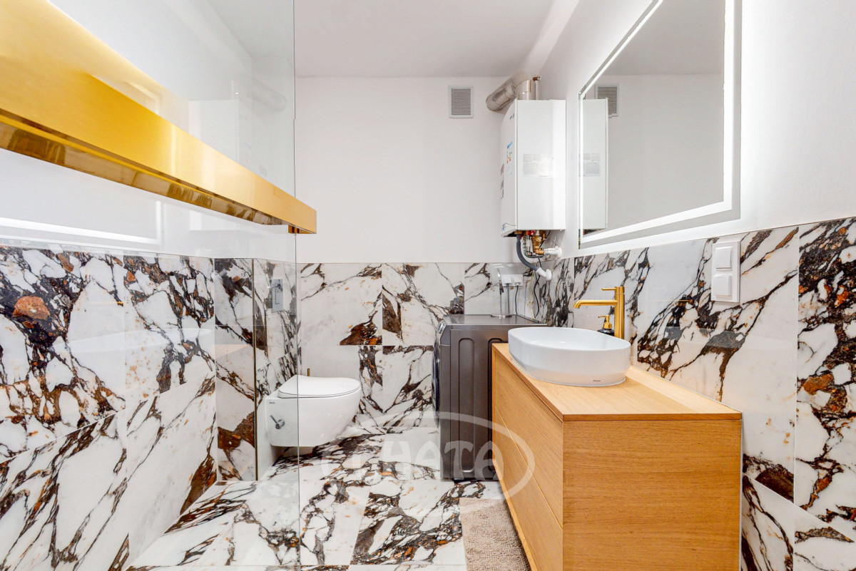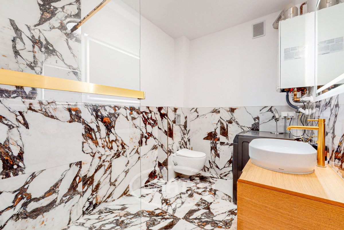 - stylową łazienkę z efektownymi dużymi płytkami, które nadają wnętrzu elegancji, oraz wygodnym prysznicem z wysokiej jakości armaturą.
