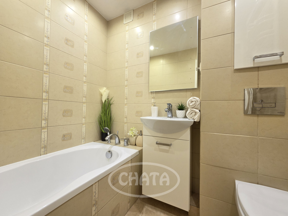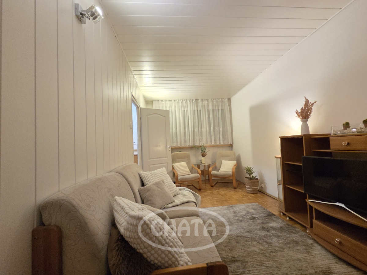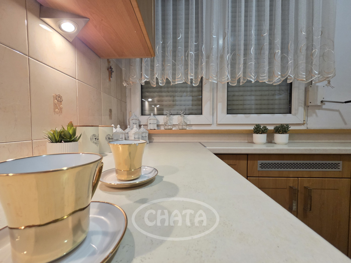 Mieszkanie umeblowane i wyposażone. W pokojach na podłodze dobrze zachowana mozaika. Z salonu wejście do jasnej, wyremontowanej kuchni z meblami oraz sprzętem AGD w zabudowie. Z sypialni wyjście na loggię. Łazienka w gustownych kaflach, z wanną. Okna PCV z roletami, ekspozycja południowa, co, w połączeniu z wysokim piętrem, sprawia, że mieszkanie jest bardzo jasne i przestronne.