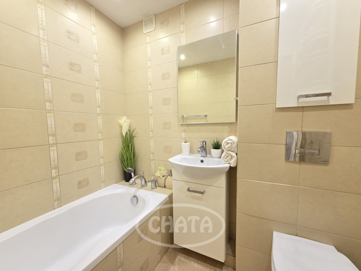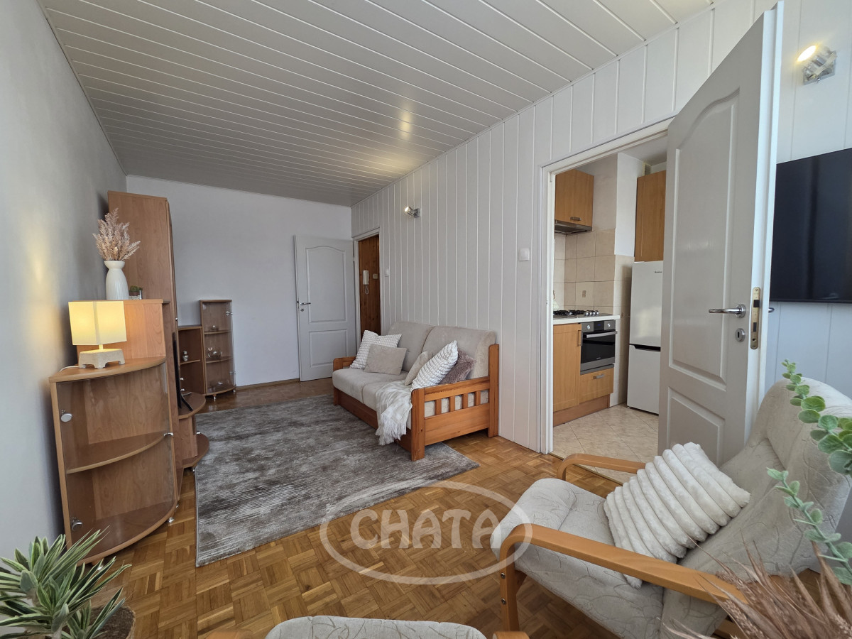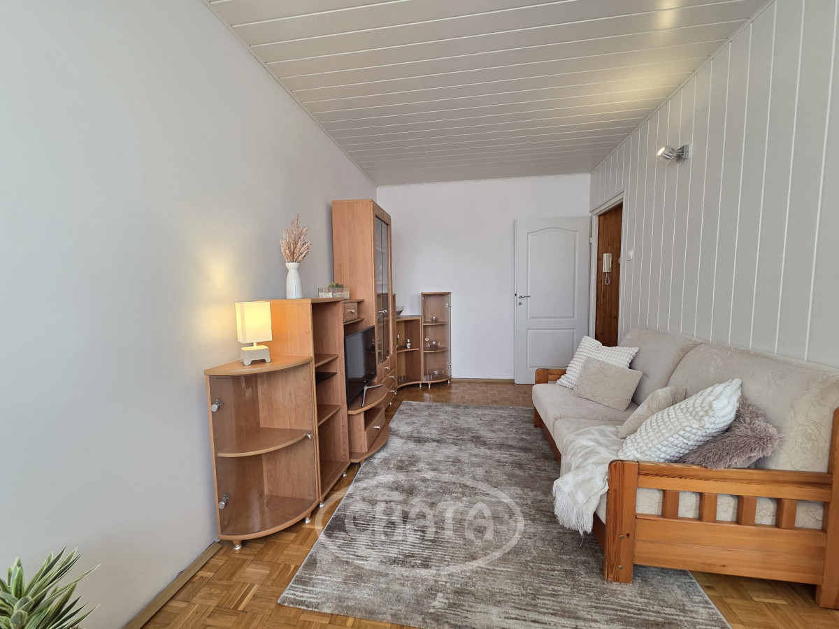 Mieszkanie umeblowane i wyposażone. W pokojach na podłodze dobrze zachowana mozaika. Z salonu wejście do jasnej, wyremontowanej kuchni z meblami oraz sprzętem AGD w zabudowie. Z sypialni wyjście na loggię. Łazienka w gustownych kaflach, z wanną. Okna PCV z roletami antywłamaniowymi, ekspozycja południowa, co, w połączeniu z wysokim piętrem, sprawia, że mieszkanie jest bardzo jasne i przestronne.