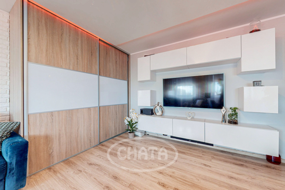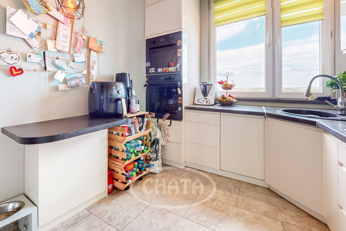 • Przestronny salon z dużym oknem i pięknym widokiem na panoramę miasta