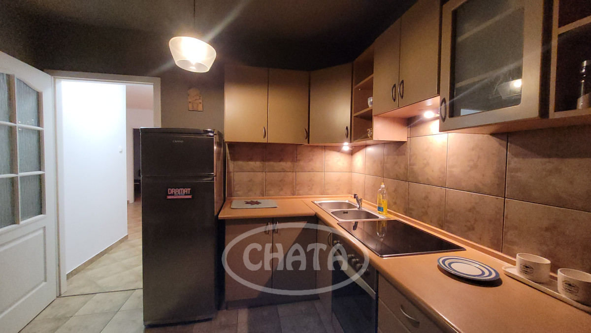 Kuchnia z meblami na wymiar, wyposażona ( lodówka, płyta grzewcza, piekarnik).