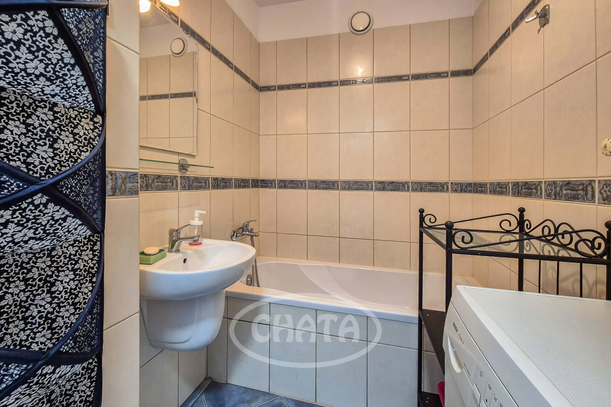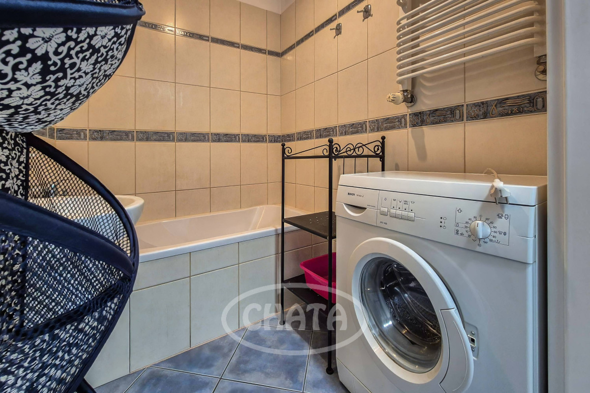 Łazienka w glazurze, z wanną i pralką. Osobno WC.