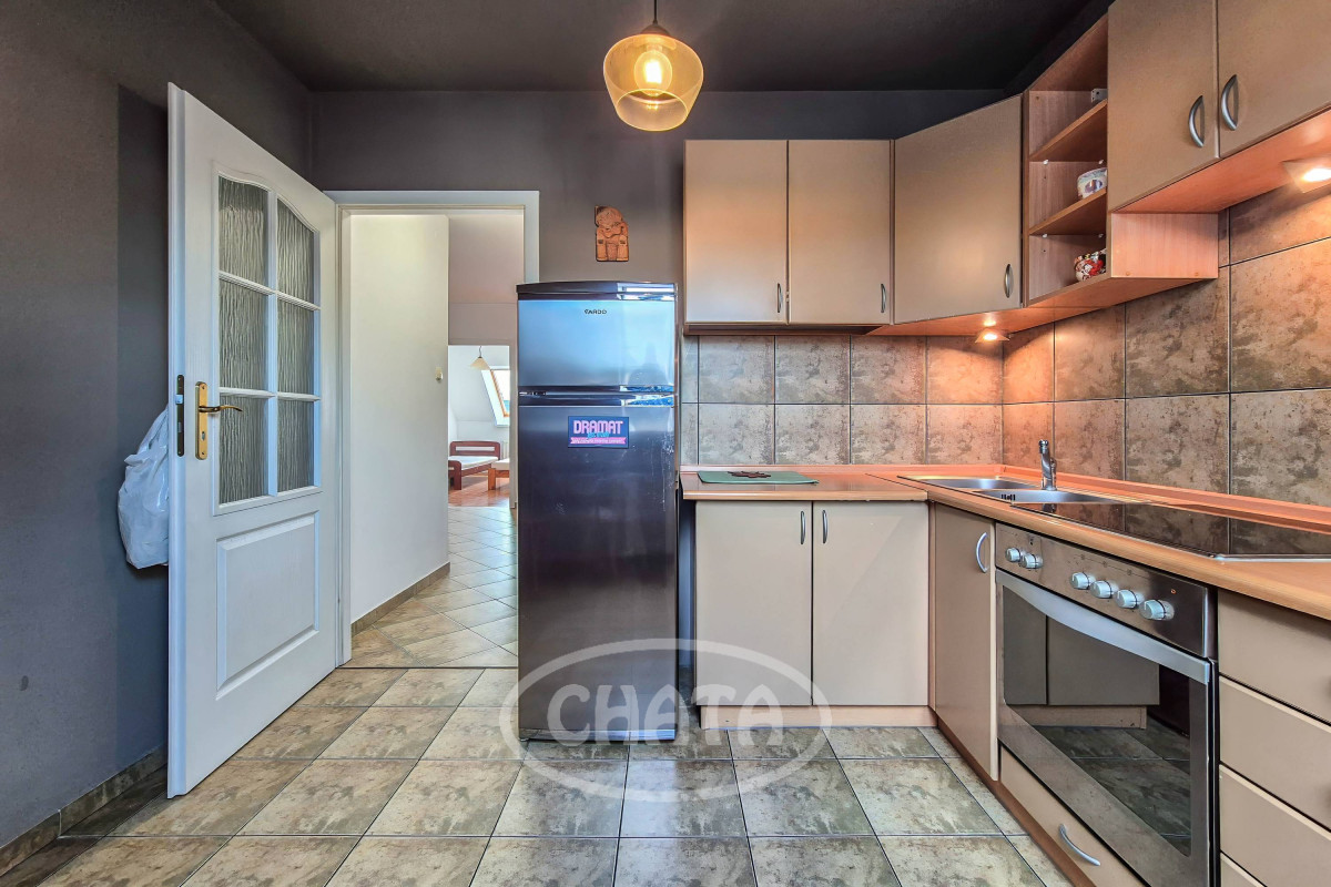 Kuchnia z meblami na wymiar, wyposażona ( lodówka, płyta grzewcza, piekarnik).