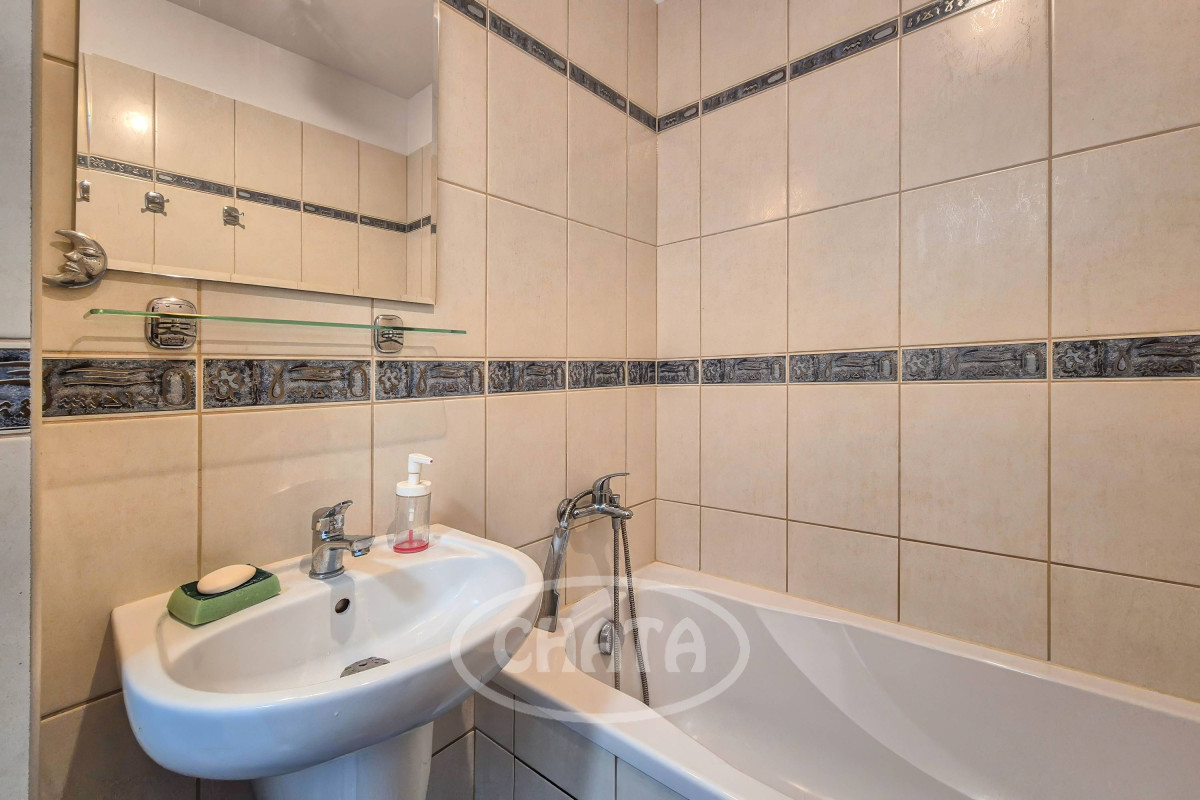 Łazienka w glazurze, z wanną i pralką. Osobno WC.