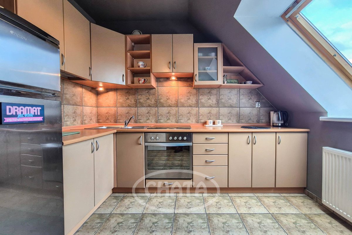 Kuchnia z meblami na wymiar, wyposażona ( lodówka, płyta grzewcza, piekarnik).