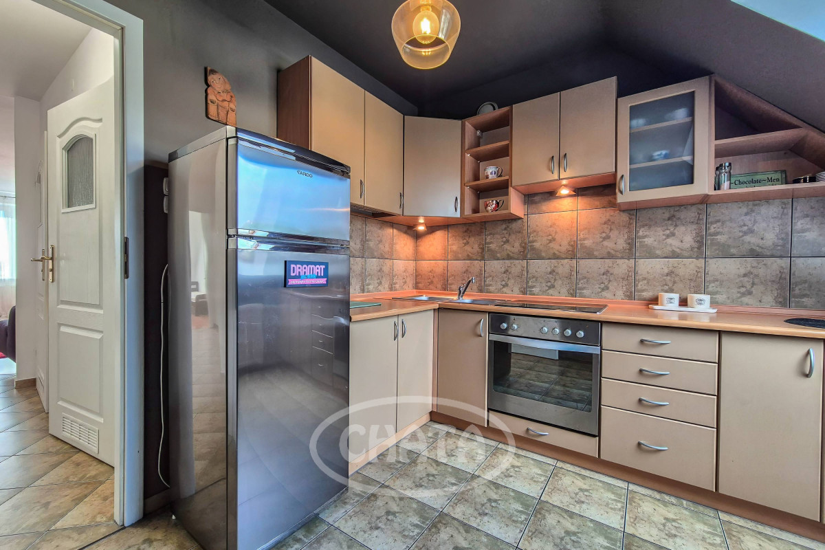 Kuchnia z meblami na wymiar, wyposażona ( lodówka, płyta grzewcza, piekarnik).