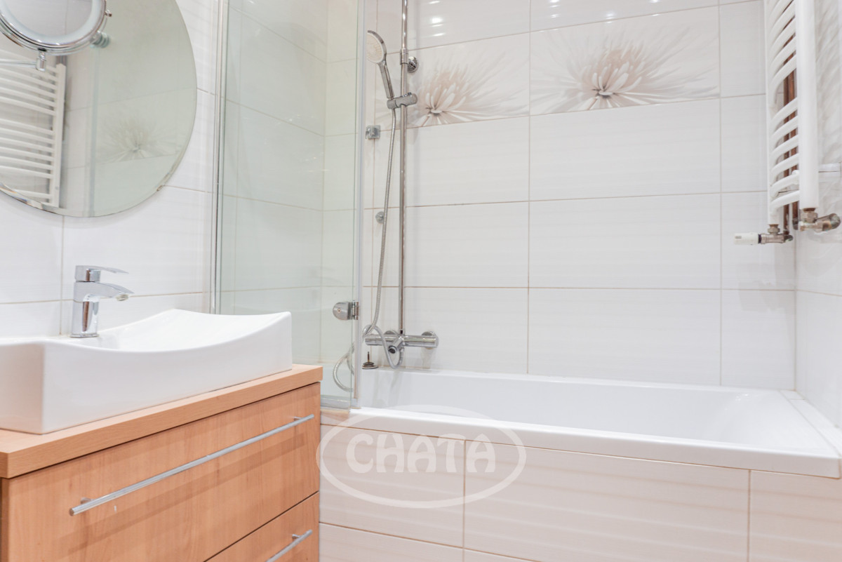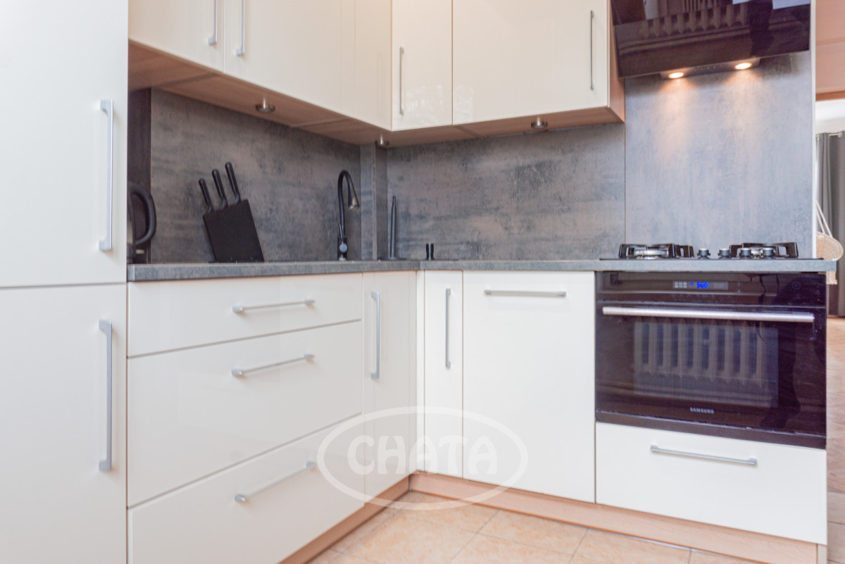 The kitchen is equipped with a large refrigerator, gas cooktop, built-in microwave (no oven), extractor hood, capsule coffee machine, kettle, as well as basic dishes and cookware. Multiple lighting points provide pleasant illumination in the evening. The apartment is connected to the city heating system.