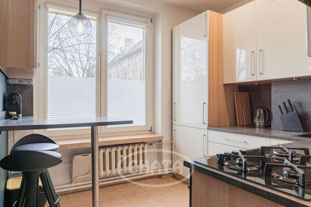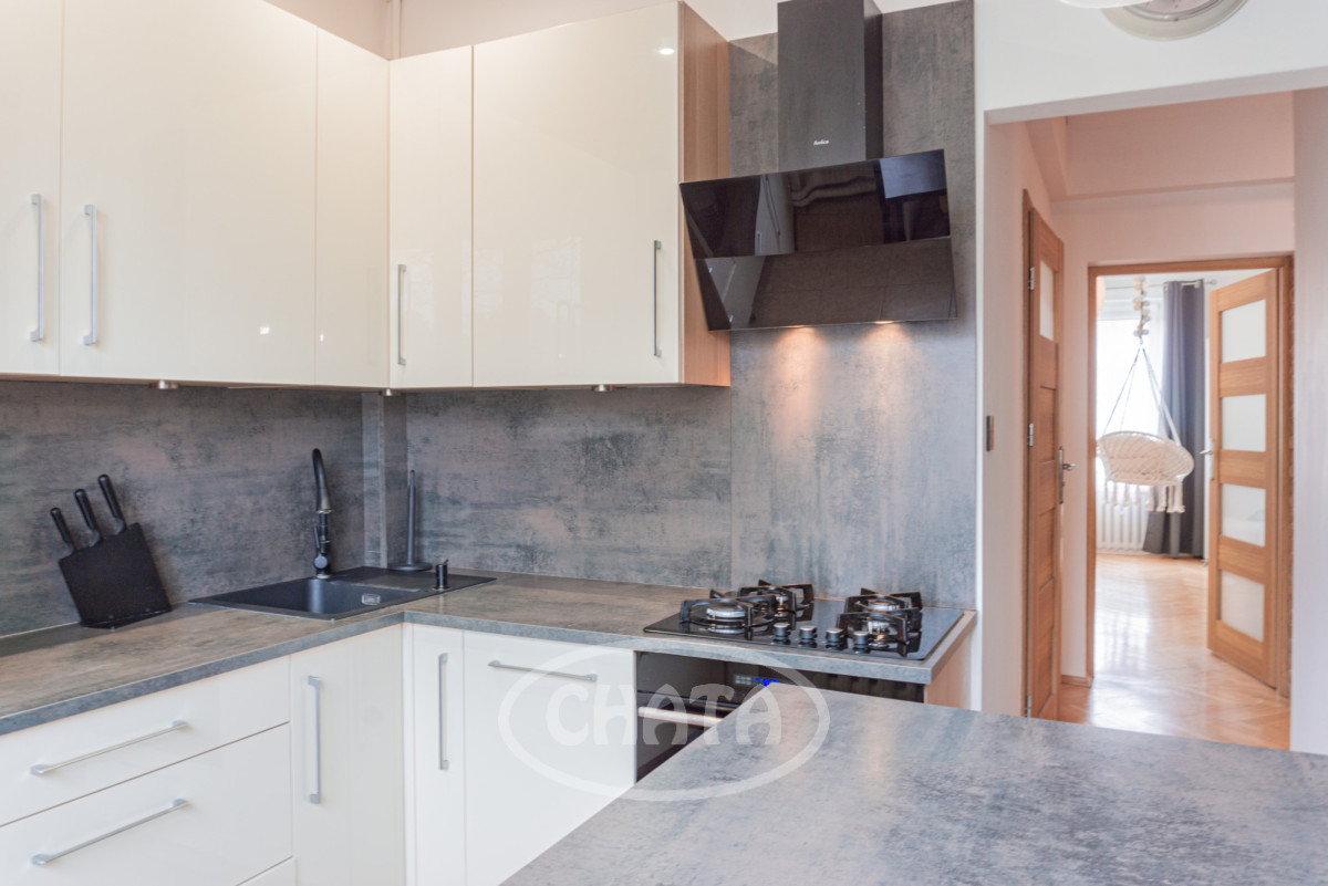 Kuchnia wyposażona jest w dużą lodówkę, płytę gazową, mikrofalówkę w zabudowie (bez piekarnika), okap, ekspres kapsułkowy, czajnik oraz podstawowe naczynia i garnki. Liczne punkty oświetleniowe zapewniają przyjemną atmosferę w mieszkaniu po zmroku. Ogrzewanie miejskie gwarantuje wygodę użytkowania.