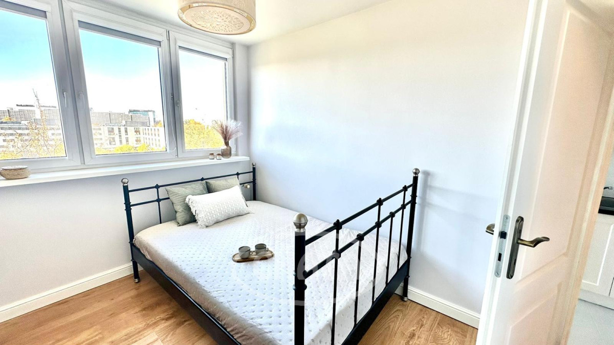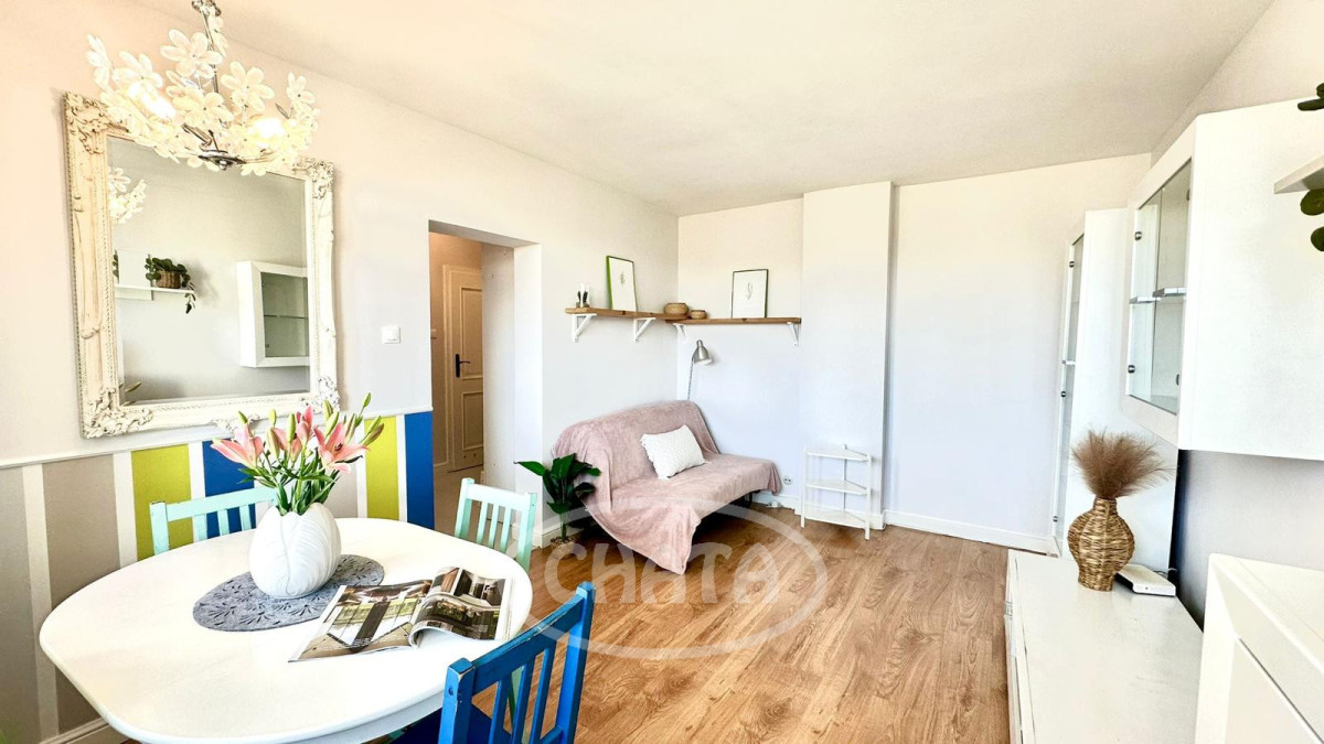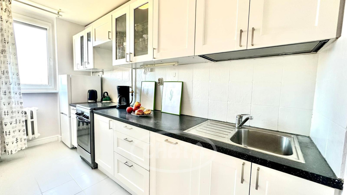 The kitchen is equipped with a large refrigerator, stove with oven, and dishwasher. The interior is very sunny and well maintained, and the neighborhood is quiet.