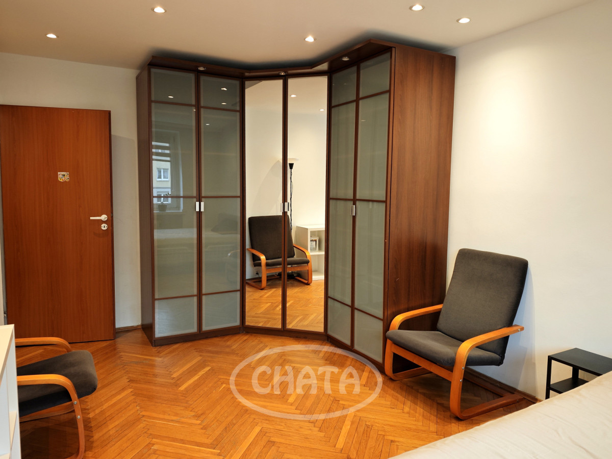Jasny duży pokój z pojemną szafą i łóżkiem dwuosobowym.
