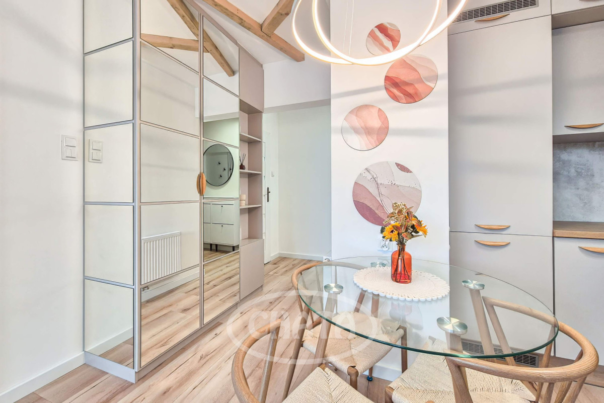 The interior is modern and functional. All furniture and household appliances are brand new. The apartment is very bright, with plenty of natural daylight. There are practical wardrobes in the bedroom and the hallway. The kitchen is equipped with a dishwasher, oven, large refrigerator, electric cooktop, and extractor hood.