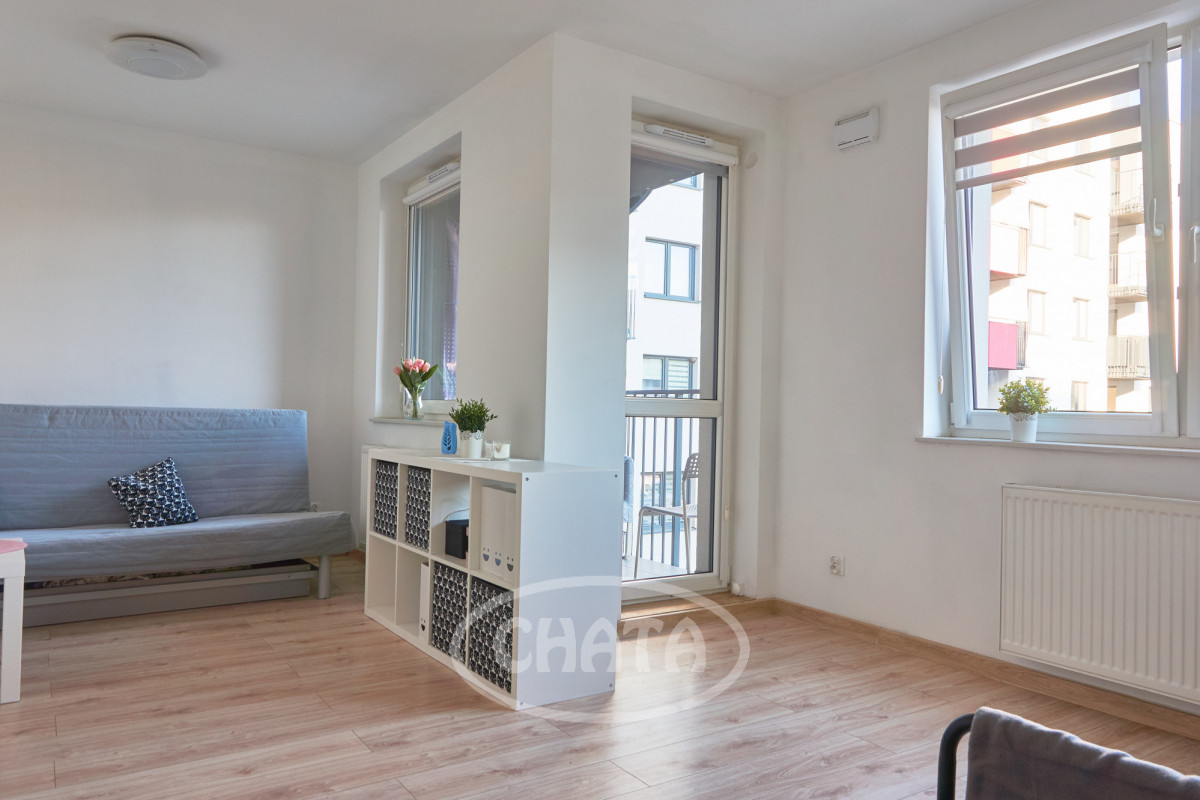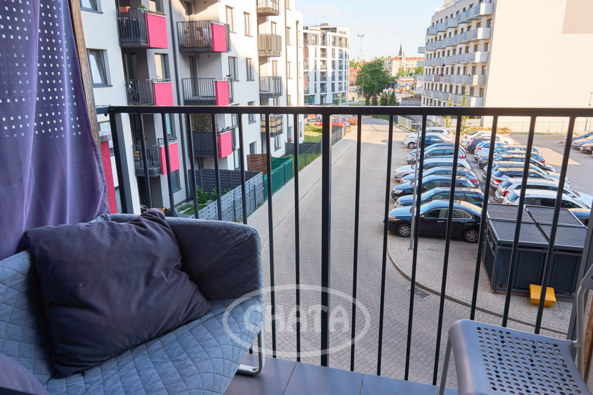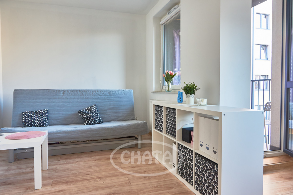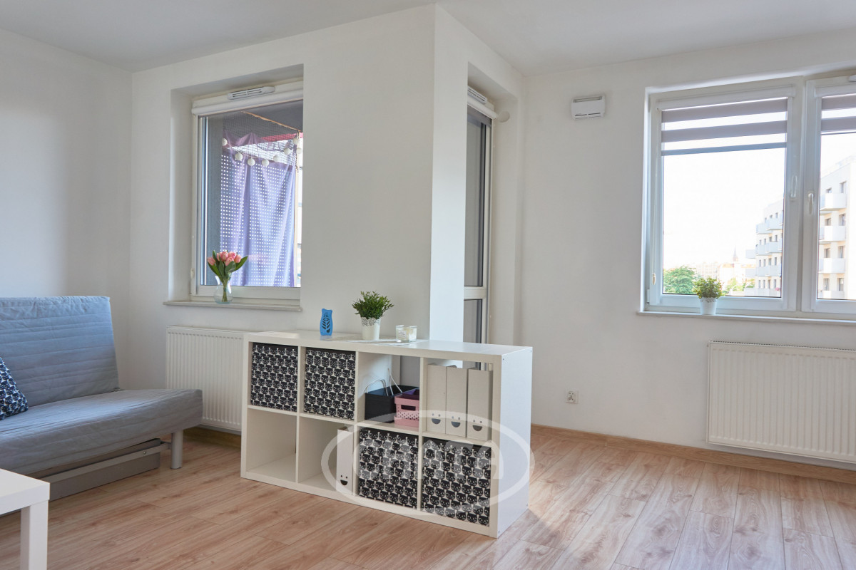 Studio apartment for rent - 32 m² in a modern residential building from 2020, located in a quiet riverside estate on Słonimskiego Street.