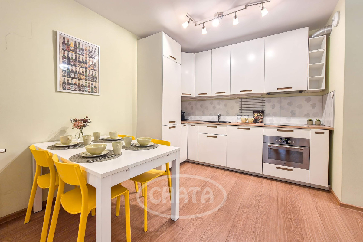 The apartment is fully equipped with kitchen appliances, tableware, a hair dryer, an iron, a vacuum cleaner, a toaster, a sandwich maker, etc. Additionally, the tenant may use the treadmill visible in the photos and the RTV set: smart TV and home theater system. The bedroom and hallway are fitted with very spacious wardrobes.