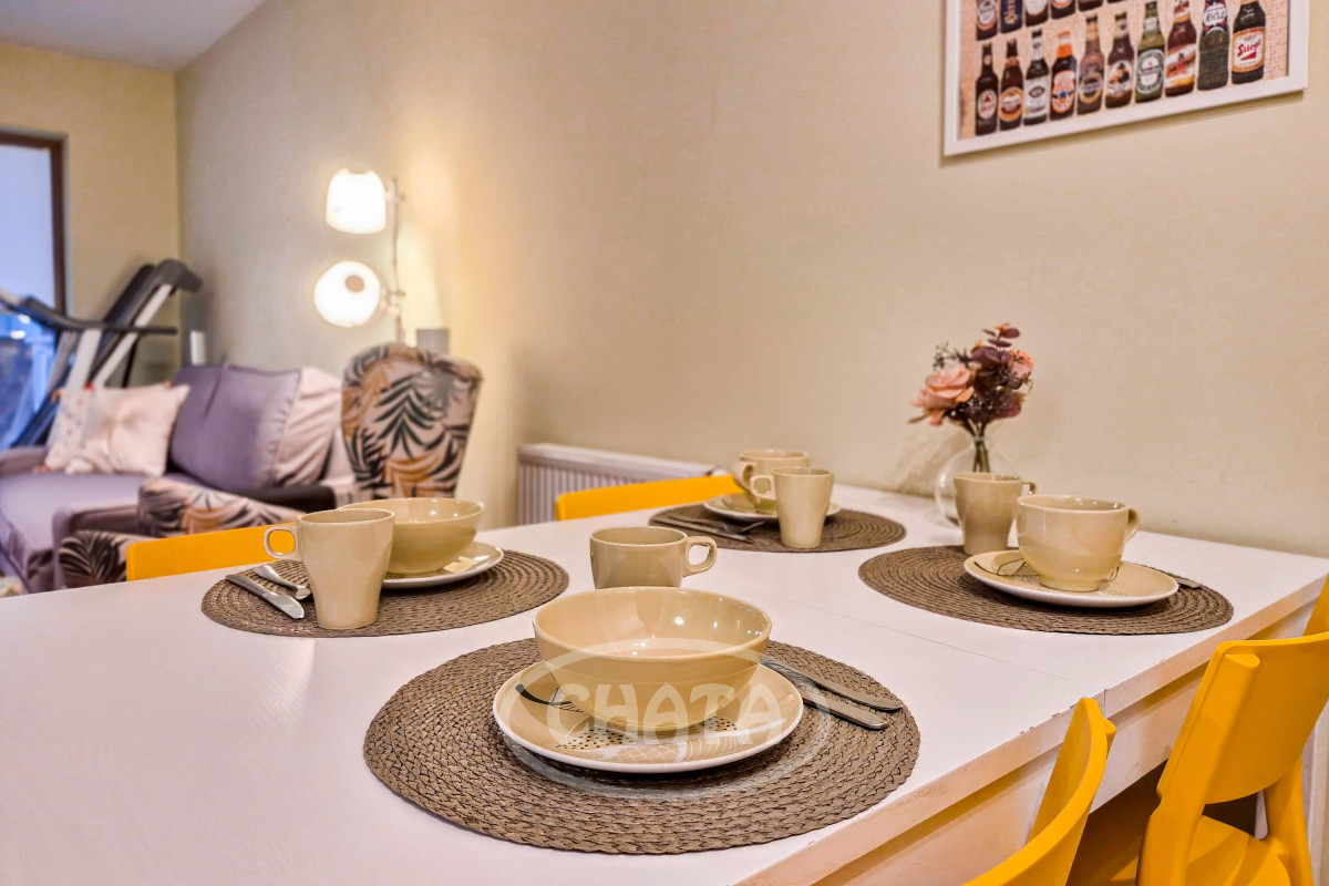 Mieszkanie jest kompleksowo wyposażone w sprzęty kuchenne, zastawę stołową, suszarkę do włosów, żelazko, odkurzacz, toster, opiekacz itp. Ponadto do dyspozycji najemcy w mieszkaniu może zostać widoczne na zdjęciach bieżnia i zestaw RTV: smart TV i kino domowe. W sypialni i przedpokoju mieszczą się bardzo pojemne szafy.