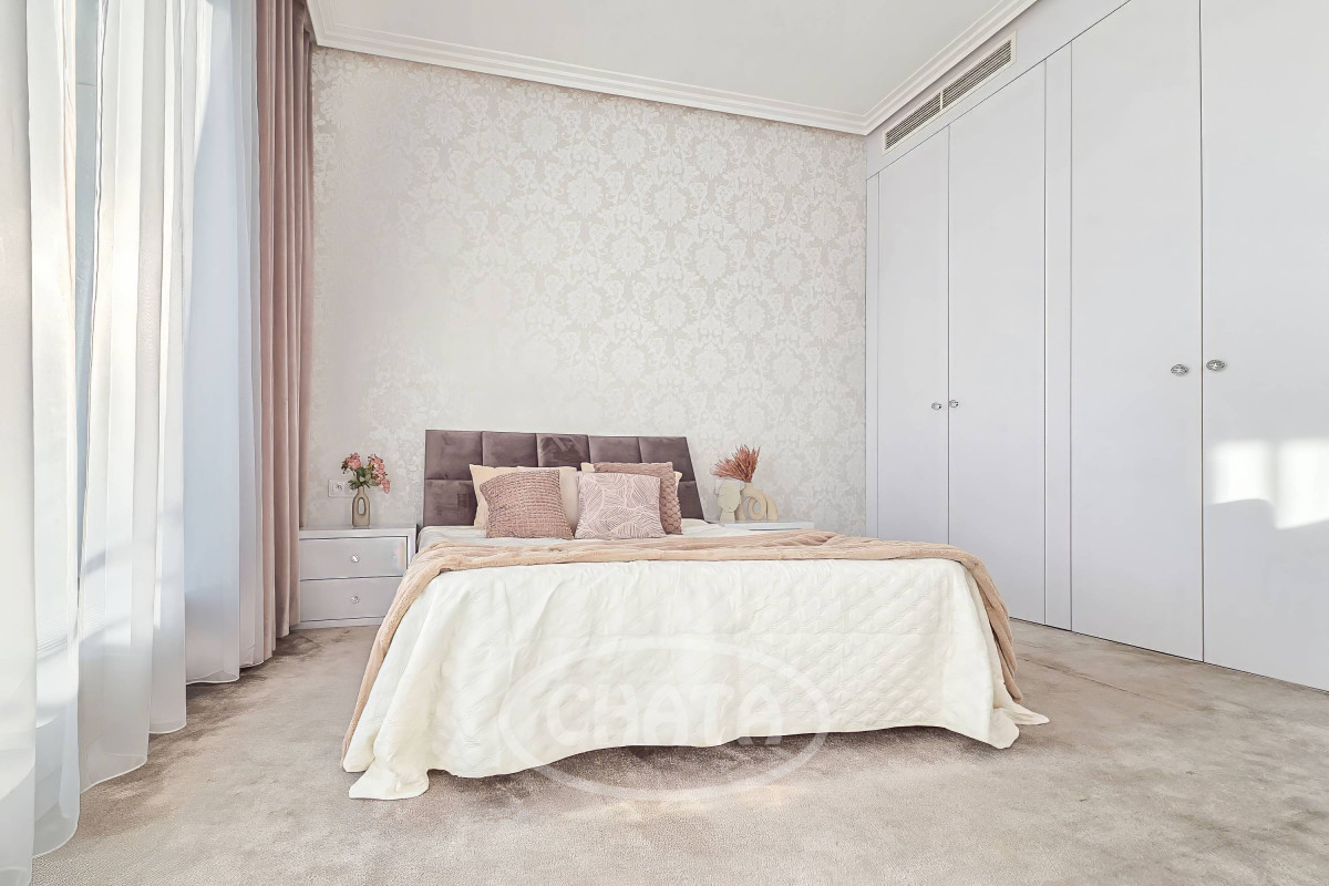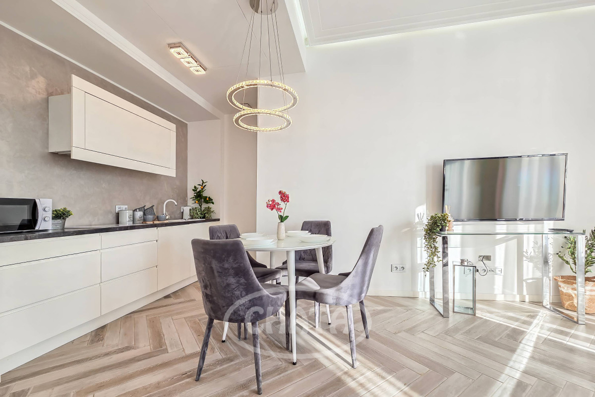 The central part of the apartment is a living room with a kitchenette, ideal for relaxing or social gatherings. On both sides of the living room are two bedrooms, each with a private bathroom - one equipped with a shower, the other with a bathtub, bidet, and spacious built-in storage. Both bedrooms, as well as the hallway, feature built-in wardrobes that offer ample storage space and an elegant look. The bedroom floors are finished with soft, cozy carpeting.