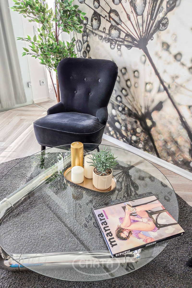 High ceilings (approx. 3 m), eastern exposure, central air conditioning, and large windows ensure brightness and comfort. Residents have access to a 24/7 reception, security, and monitoring. The tenant also has access to a parking space in the building’s underground garage.