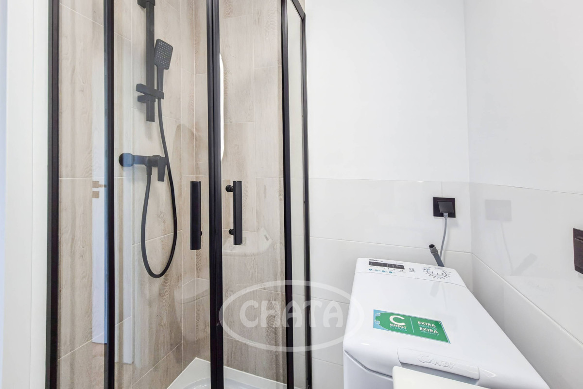 Łazienka z wc w glazurze, z kabiną prysznicową i pralką.