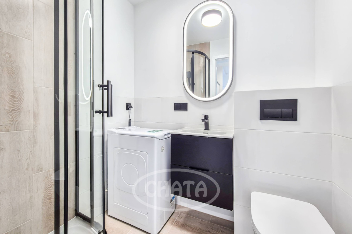 Łazienka z wc w glazurze, z kabiną prysznicową i pralką.