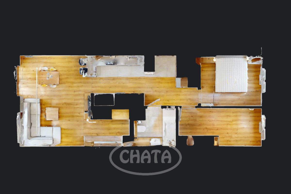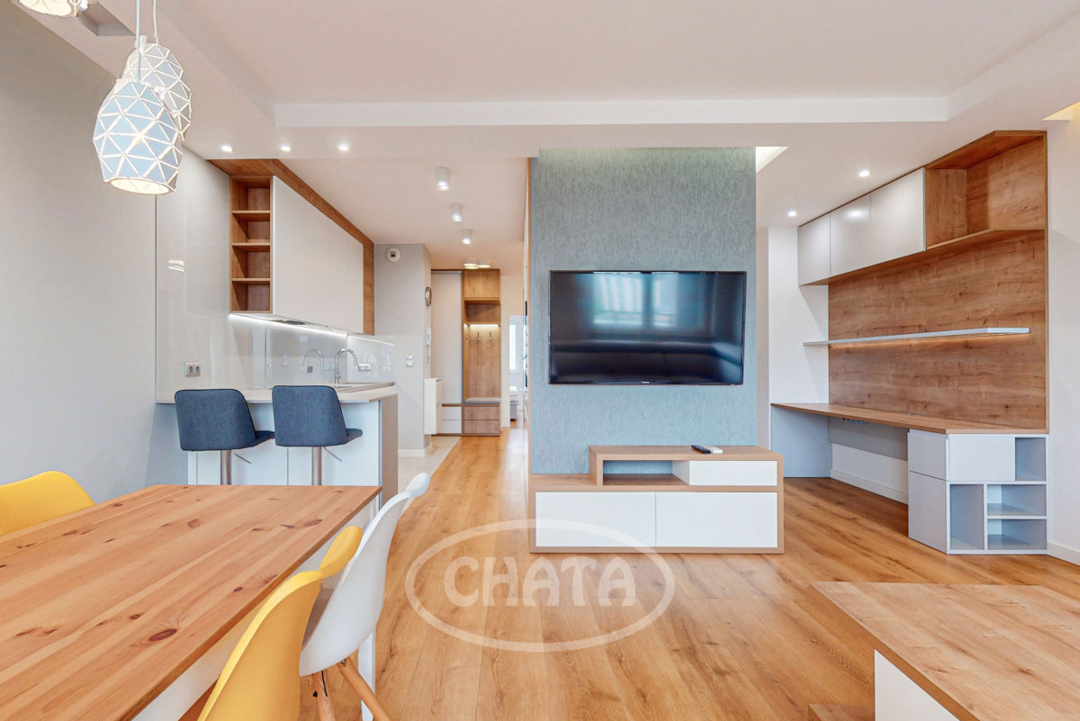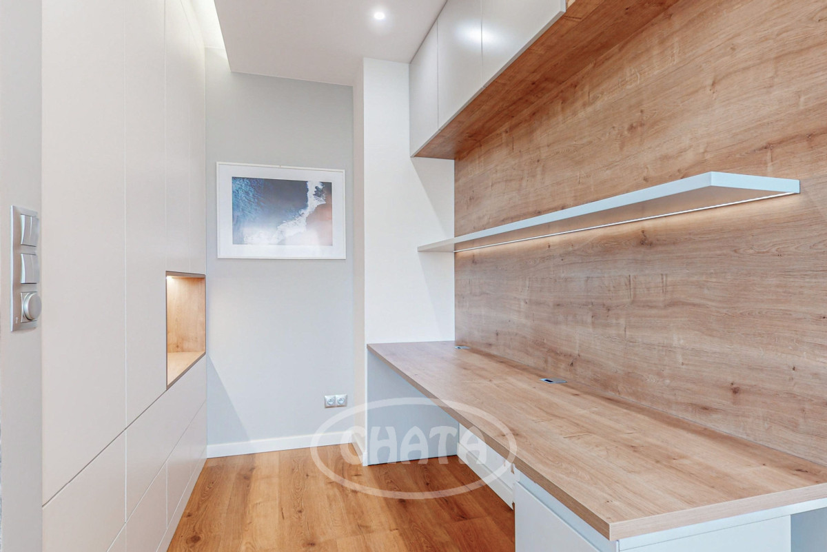 - salonu z jadalnią (wyposażonego w wygodny rozkładany narożnik z pojemnikiem na pościel, stolik, stół wraz z 4 krzesłami, TV wraz z szafką pod TV, klimatyzację). W salonie wydzielona jest komfortowa część biurowa, z dużym biurkiem oraz szafami w zabudowie z cichym domykiem.