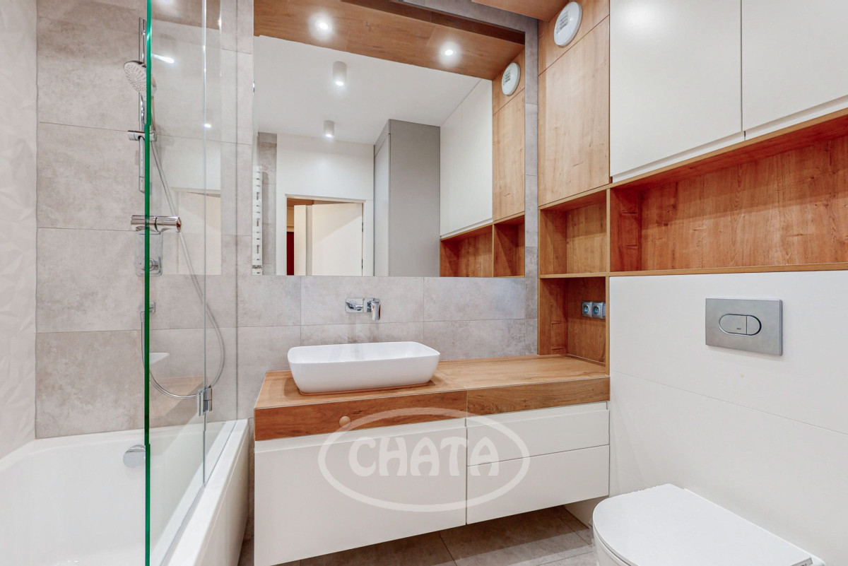 - łazienki (wyposażonej w wannę z prysznicem, szafki łazienkowe w zabudowie, umywalkę, wbudowany sortownik na pranie, toaletę, pralko-suszarkę w zabudowie oraz grzejnik z możliwością przełączenia w tryb elektryczny).