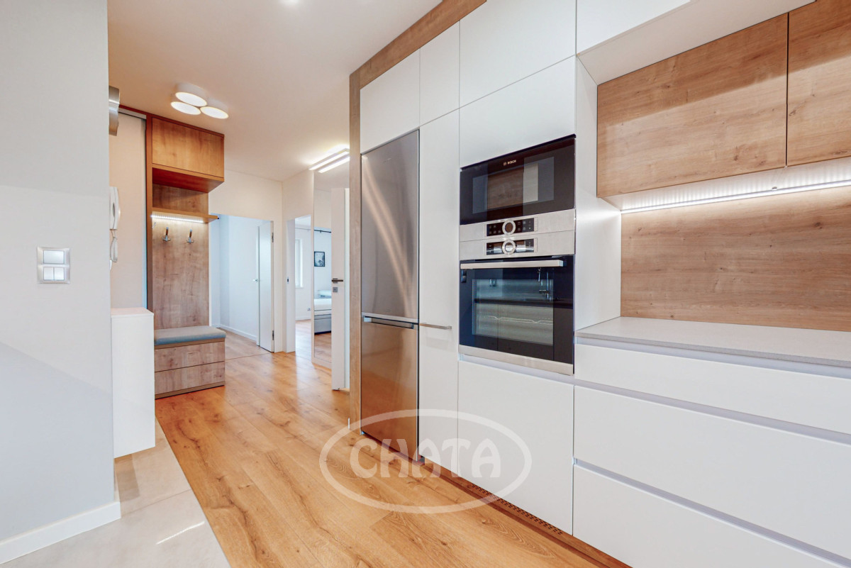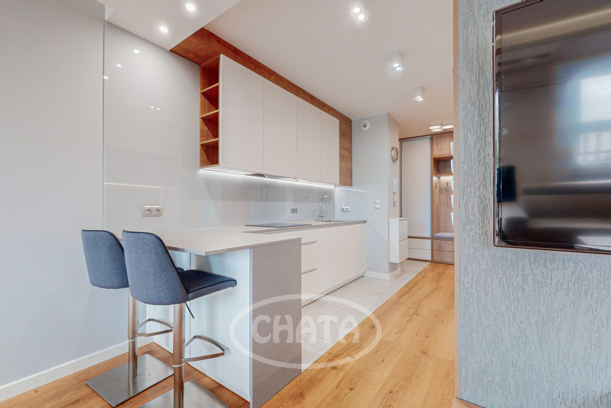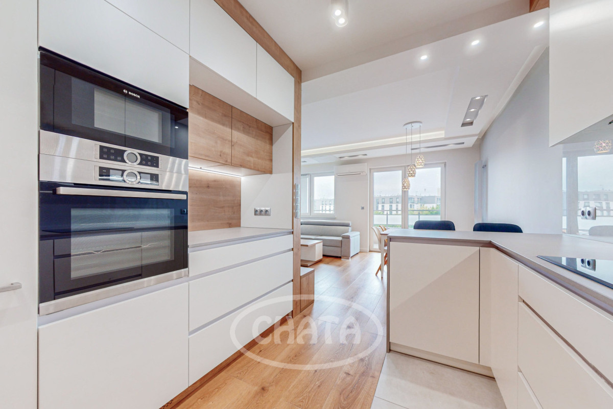 - kuchni (wyposażonej w wysokiej jakości meble w zabudowie, szuflady z funkcją cichego domyku, wyspę, hokery, markowy sprzęt AGD: tj. piekarnik, kuchenkę mikrofalową, płytę indukcyjną, zmywarkę 60 cm, lodówkę z zamrażarką no frost, kamienny blat oraz wygodne cargo)