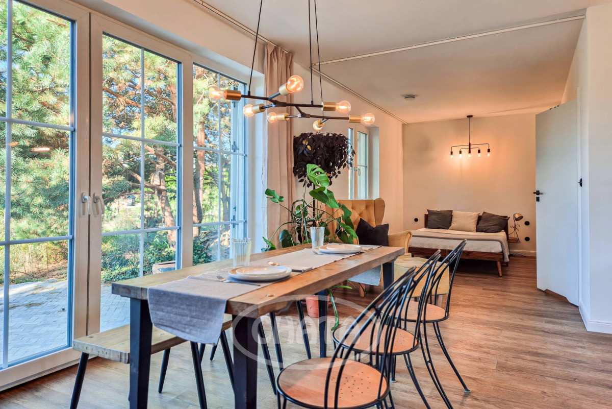 Duża narożna działka o powierzchni 1060 m2. Ogród zagospodarowany w stylu "ogrodu angielskiego". Liczne nasadzenia, oraz duże sosny rosnące tuż przy tarasie, tworzą klimat potrzebny do wypoczynku i relaksu.