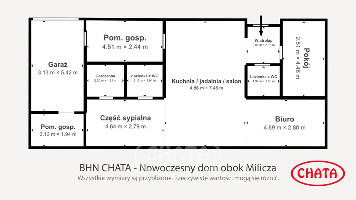- garaż w bryle budynku o powierzchni 17 m2, który w razie potrzeby może zostać przystosowany na potrzeby mieszkaniowe.