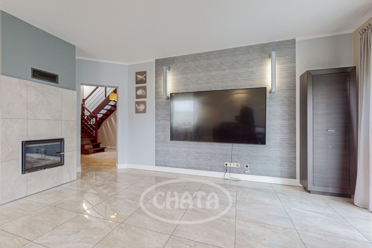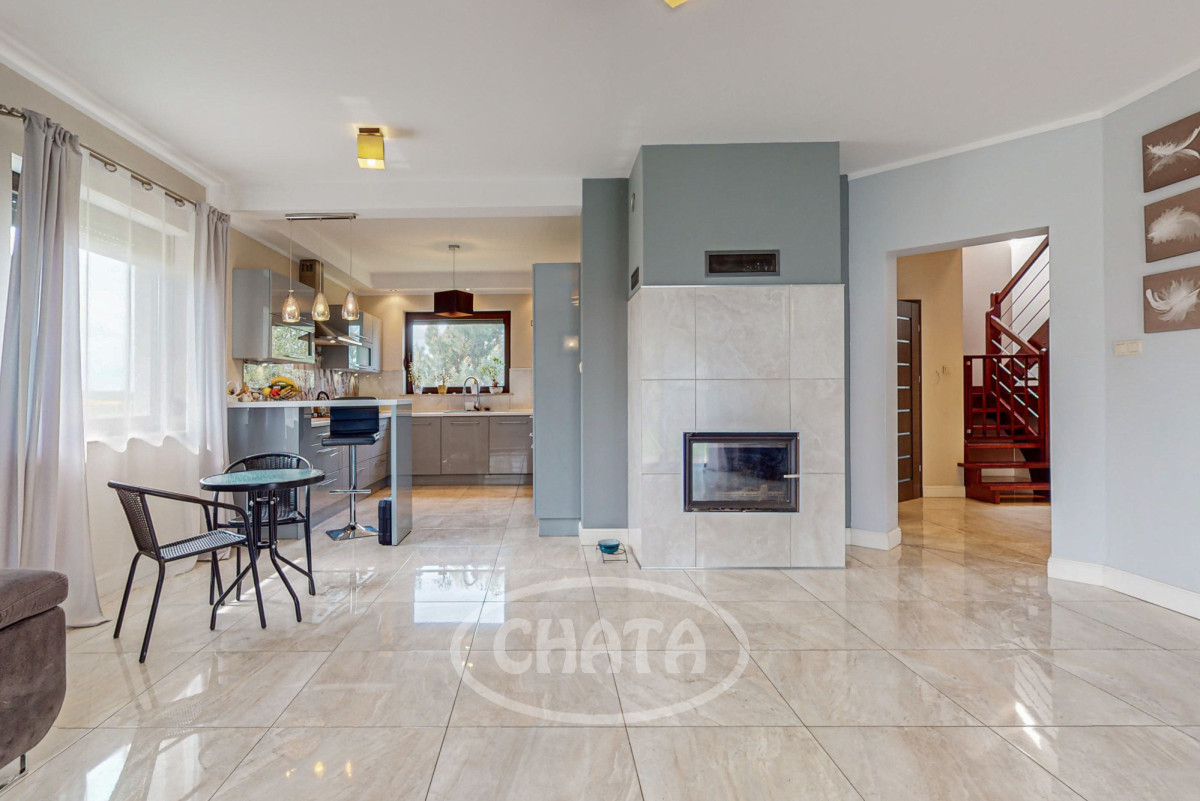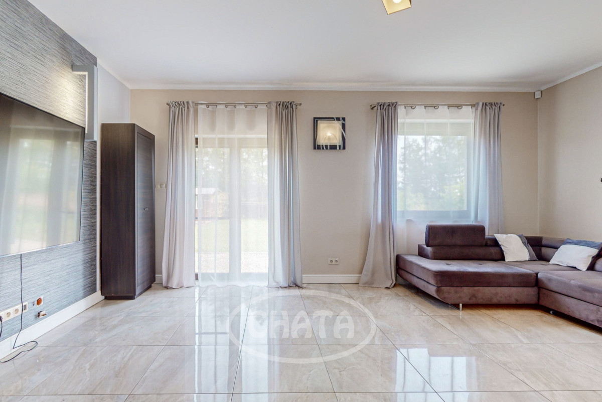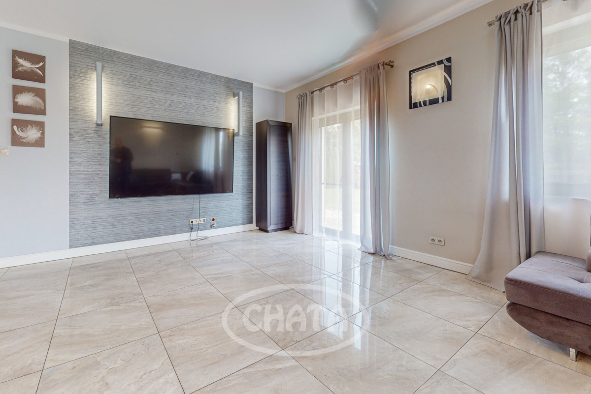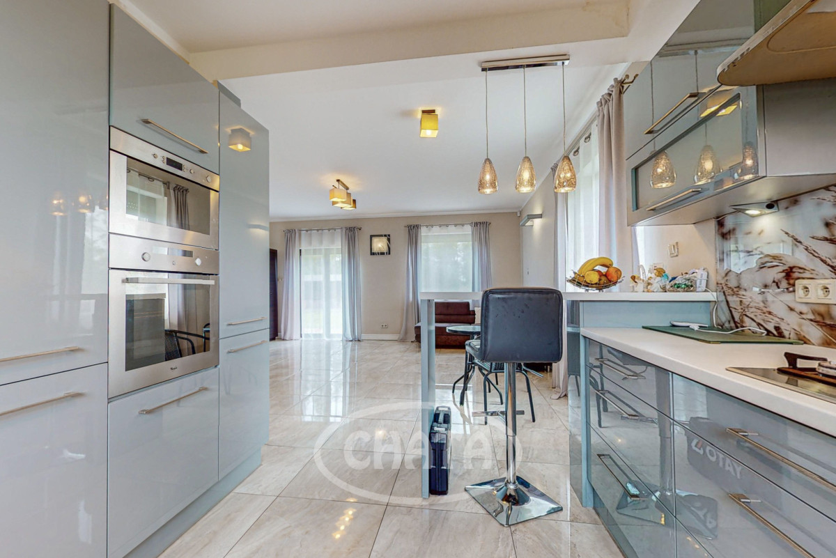 - salon z kuchnią, słoneczny z wyjściem na taras i ogród. Kuchnia wyposażona jw markowy sprzęt AGD: (lodówkę, osobną zamrażarkę, piekarnik, kuchenkę mikrofalową, kuchenkę gazową, zmywarkę oraz filtr uzdatniania wody). Meble w zabudowie w ładnej kolorystce. W salonie znajduje się wygodna sofa z funkcja spania oraz bardzo duży TV 86 cali. Kominek pełni funkcje dekoracyjne (wyłączony z użytkowania).