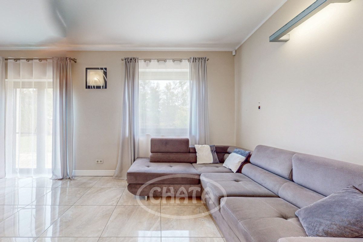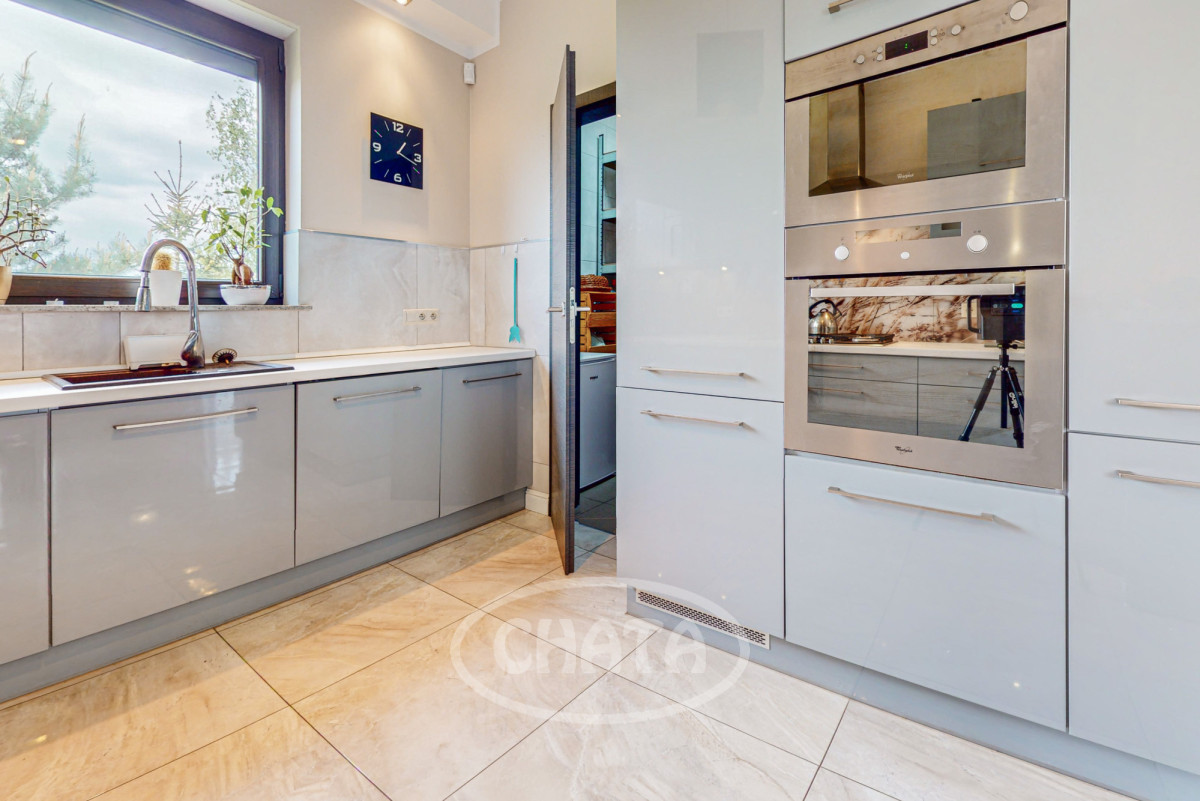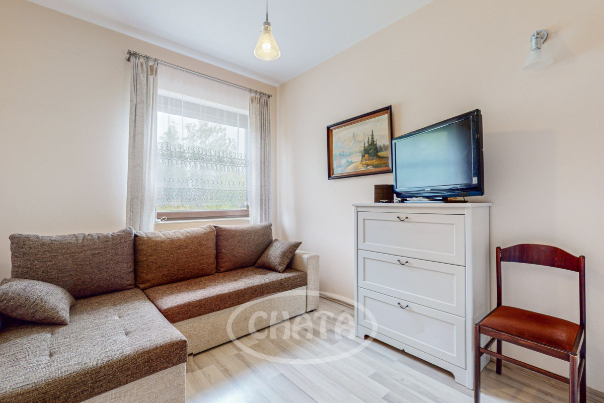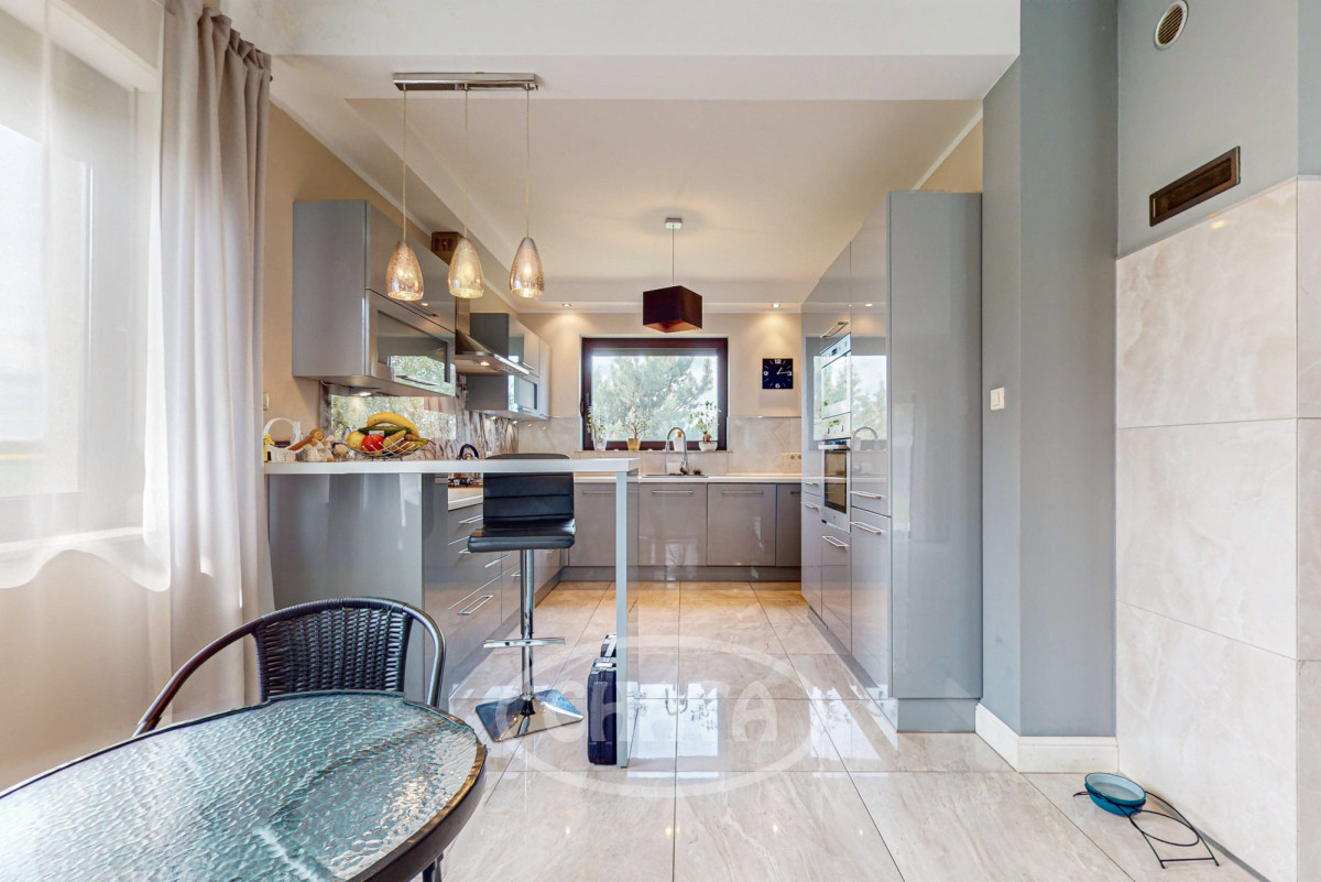- salon z kuchnią, słoneczny z wyjściem na taras i ogród. Kuchnia wyposażona jw markowy sprzęt AGD: (lodówkę, osobną zamrażarkę, piekarnik, kuchenkę mikrofalową, kuchenkę gazową, zmywarkę oraz filtr uzdatniania wody). Meble w zabudowie w ładnej kolorystce. W salonie znajduje się wygodna sofa z funkcja spania oraz bardzo duży TV 86 cali. Kominek pełni funkcje dekoracyjne (wyłączony z użytkowania).