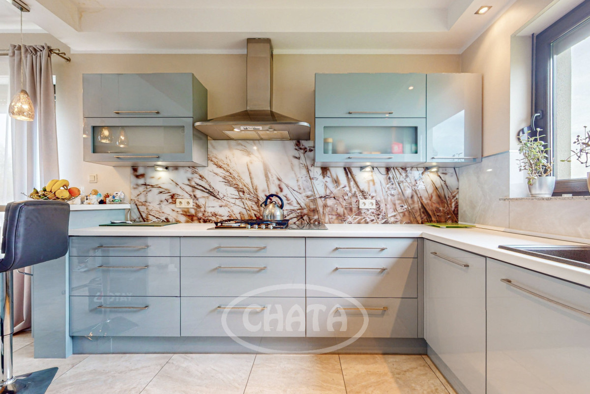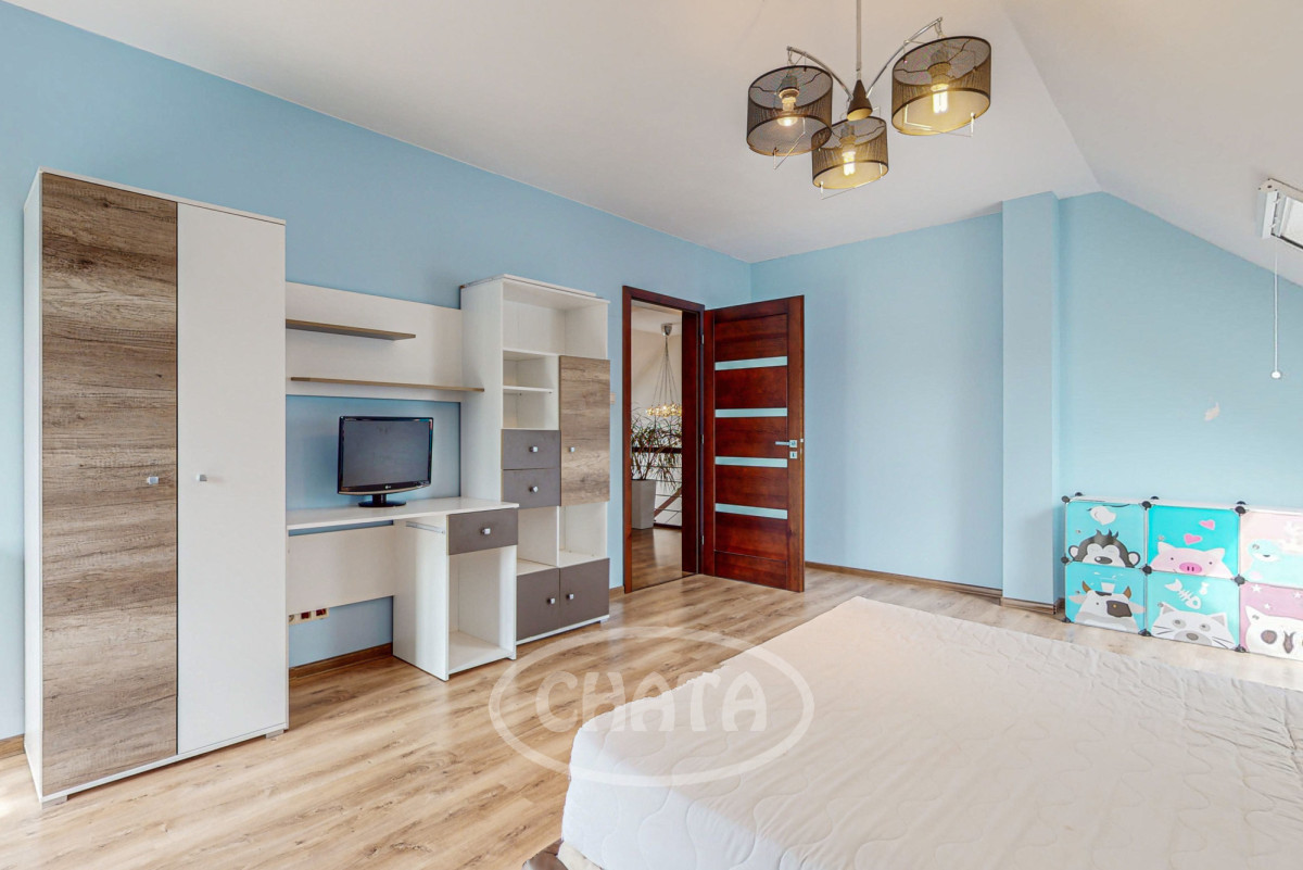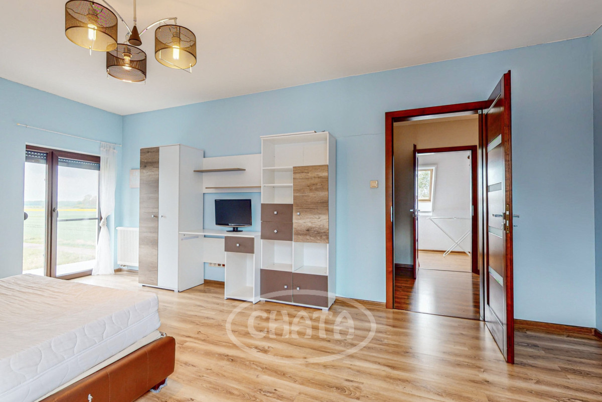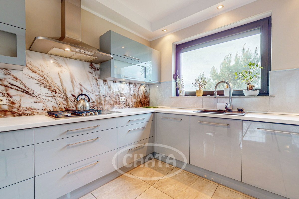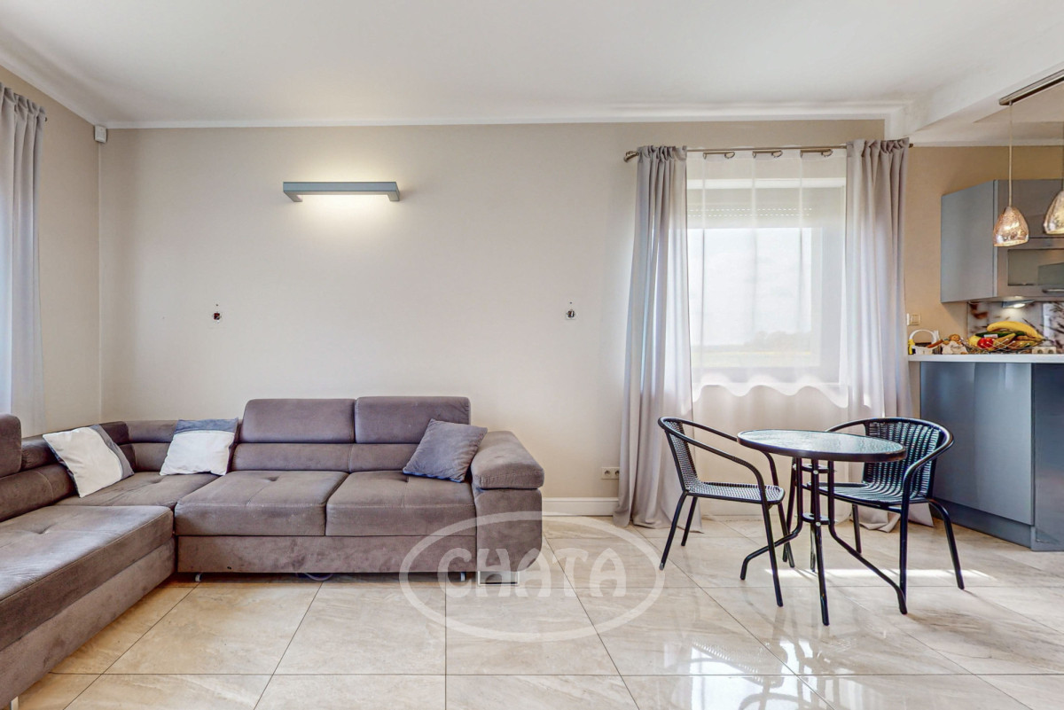 - salon z kuchnią, słoneczny z wyjściem na taras i ogród. Kuchnia wyposażona jw markowy sprzęt AGD: (lodówkę, osobną zamrażarkę, piekarnik, kuchenkę mikrofalową, kuchenkę gazową, zmywarkę oraz filtr uzdatniania wody). Meble w zabudowie w ładnej kolorystce. W salonie znajduje się wygodna sofa z funkcja spania oraz bardzo duży TV 86 cali. Kominek pełni funkcje dekoracyjne (wyłączony z użytkowania).