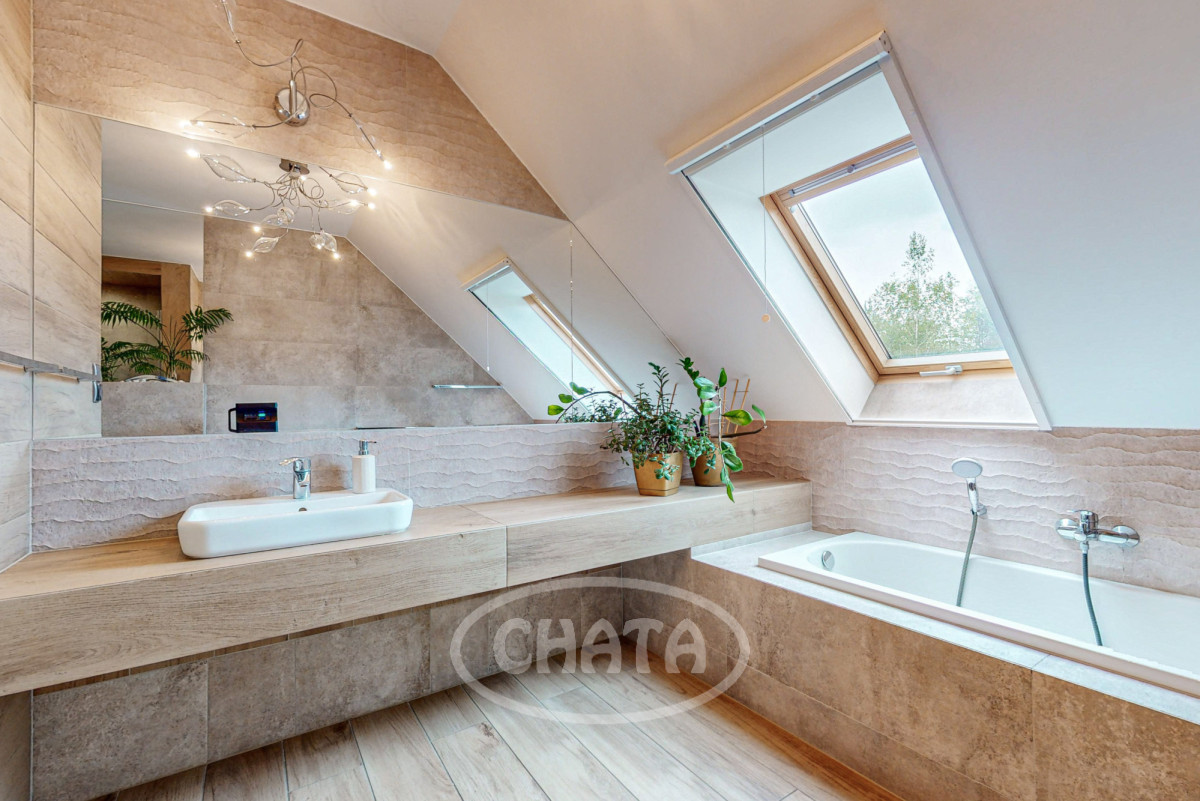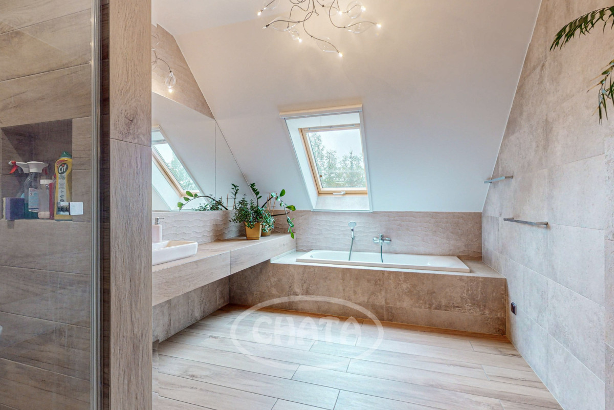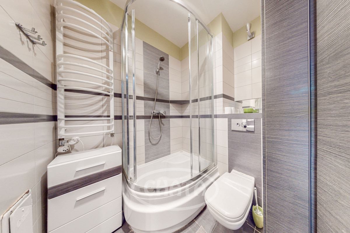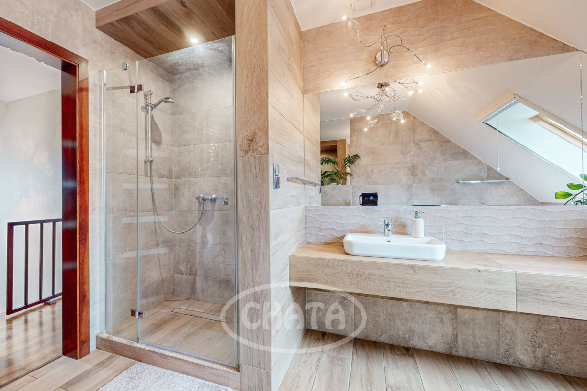 - stylowa łazienka z wanną oraz dużą kabiną prysznicową