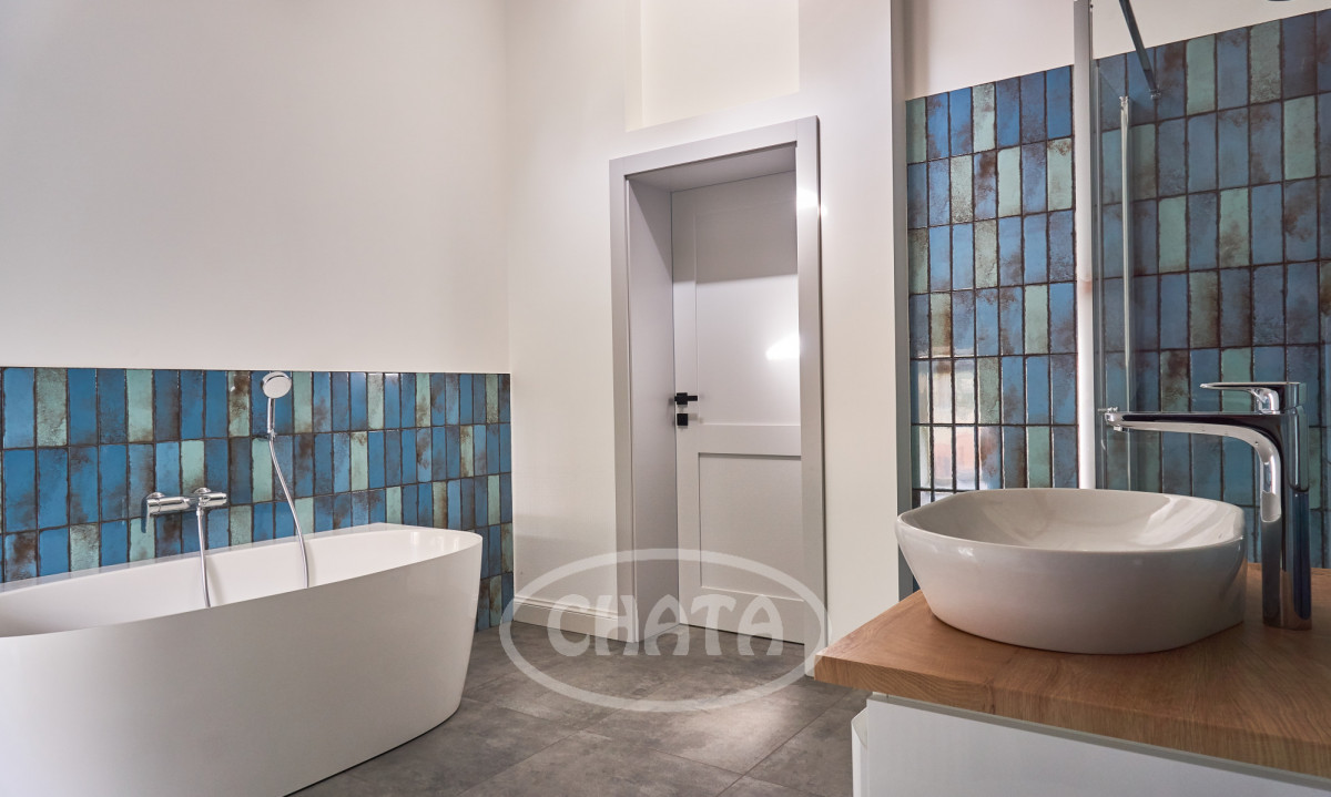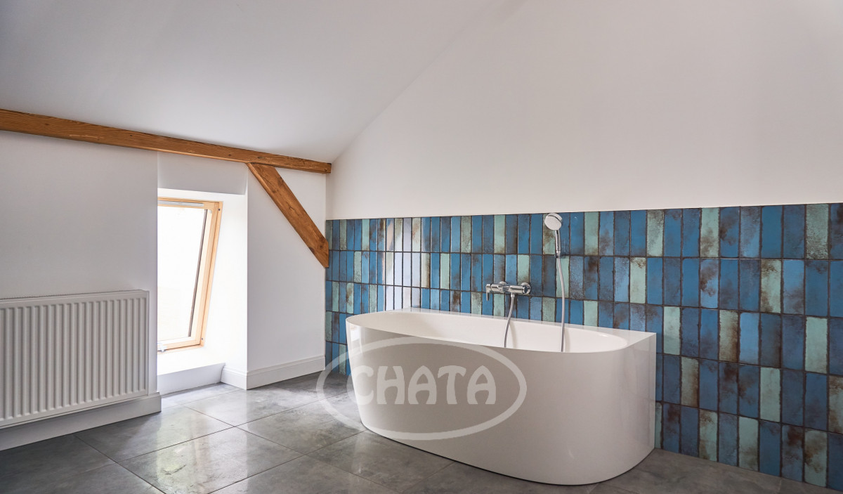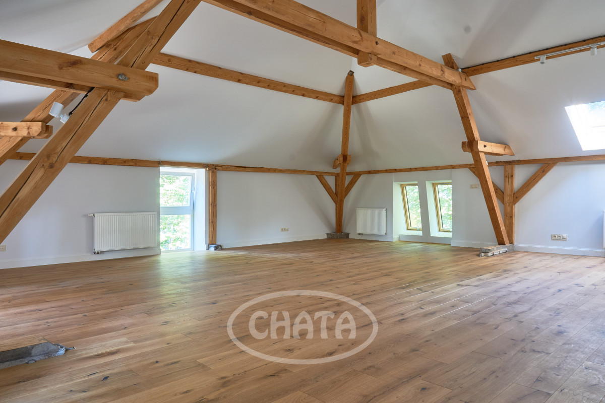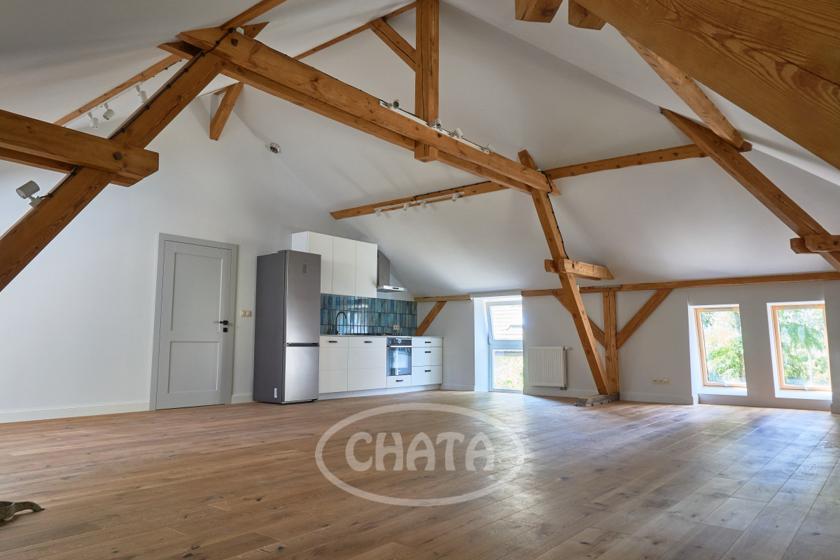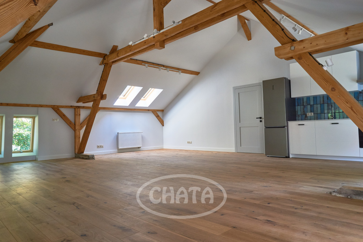 The equipment includes brand-new, high-quality household appliances: a large refrigerator, oven, gas hob, dishwasher, and extractor hood. The kitchen countertop is made of conglomerate. The floors are finished with beautiful oak boards, and the refreshed wooden structural elements give the interior a unique atmosphere.