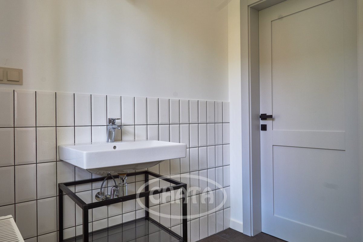 The upper floor has been arranged as a residential/office area. The tenant will have access to a large open space with a kitchenette (67 m²), a room (11 m²), and a bathroom (12.4 m²), as well as an additional bathroom on the ground floor.