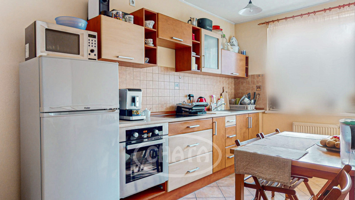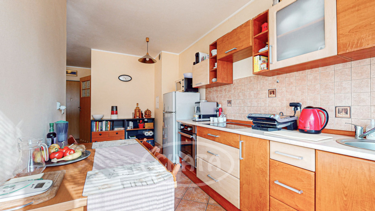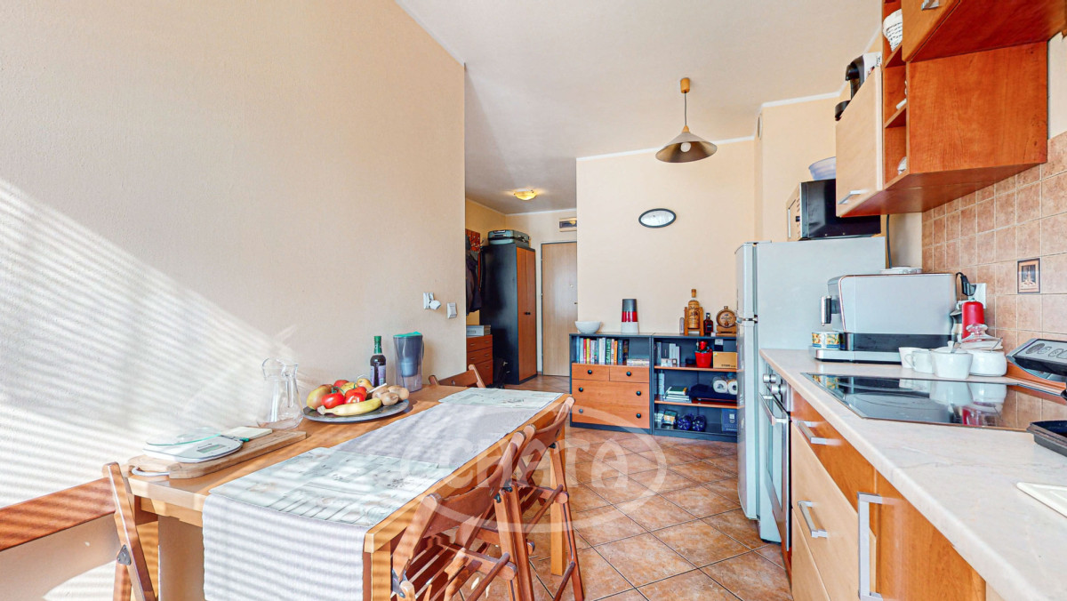 Kuchnia z jadalnią umeblowana, wyposażona w sprzęt AGD (lodówka, płyta, piekarnik).