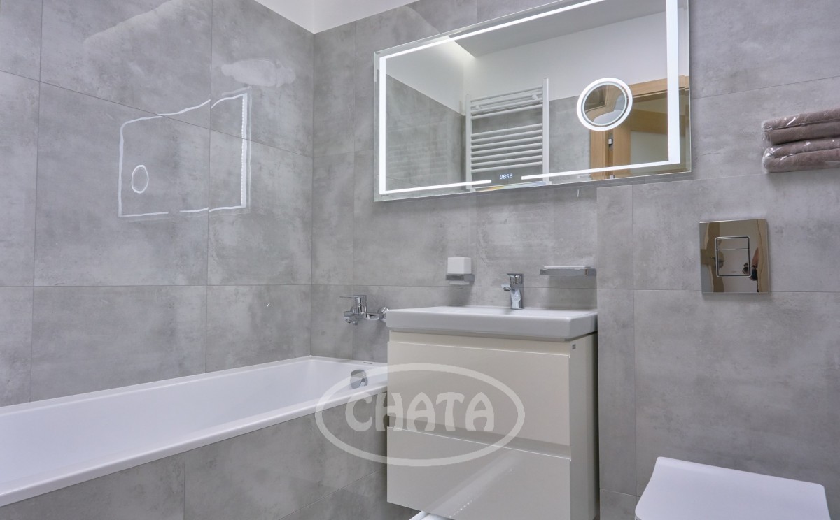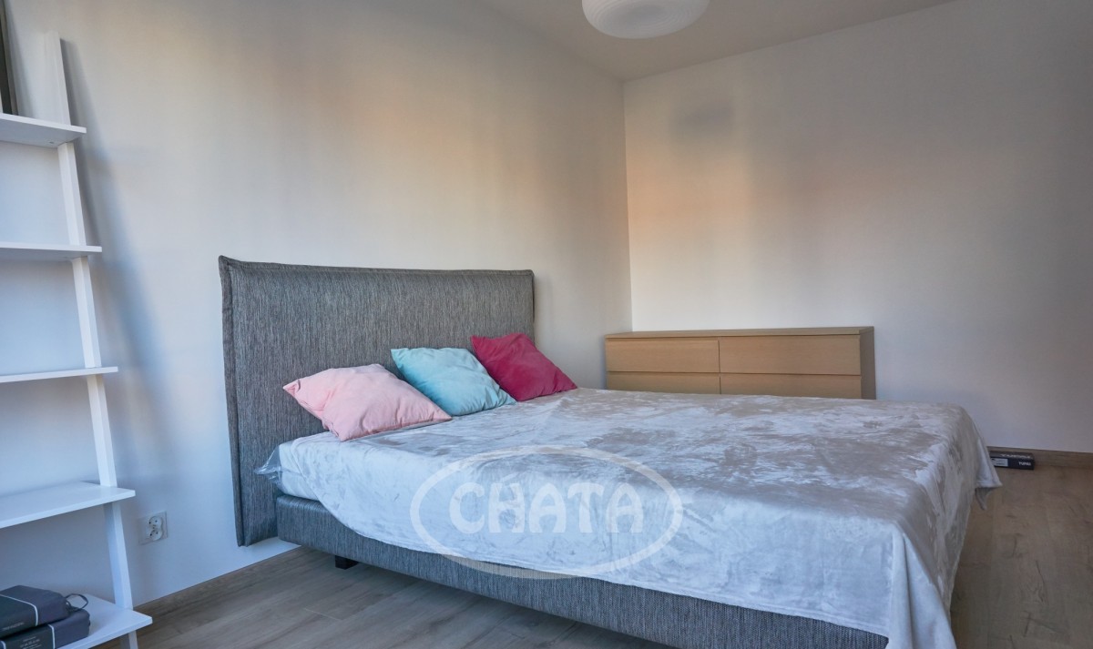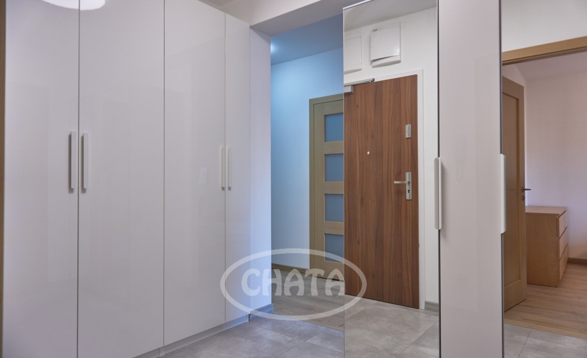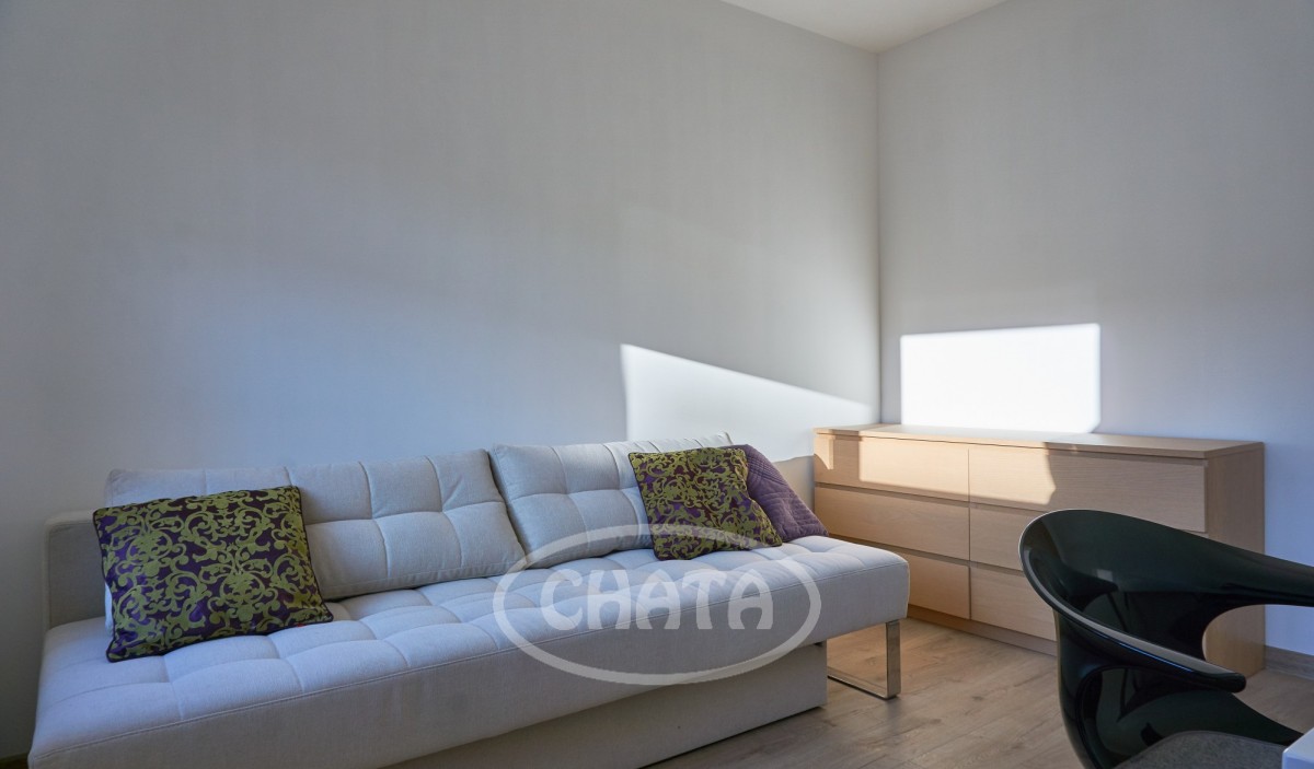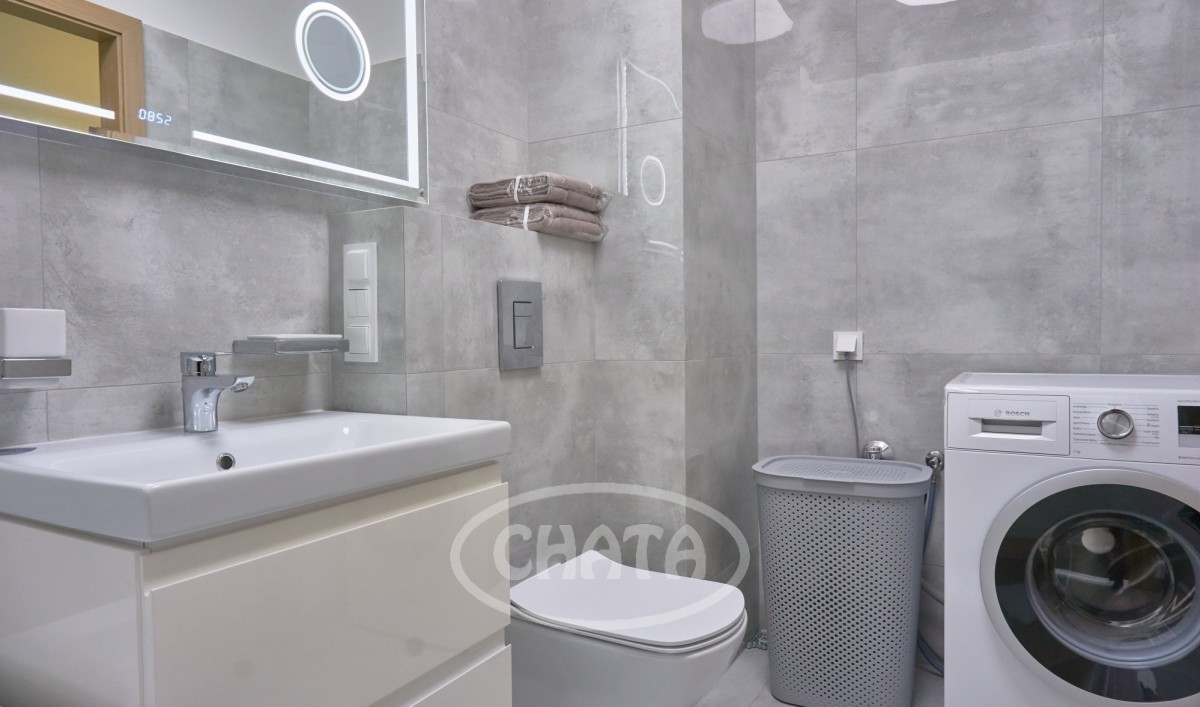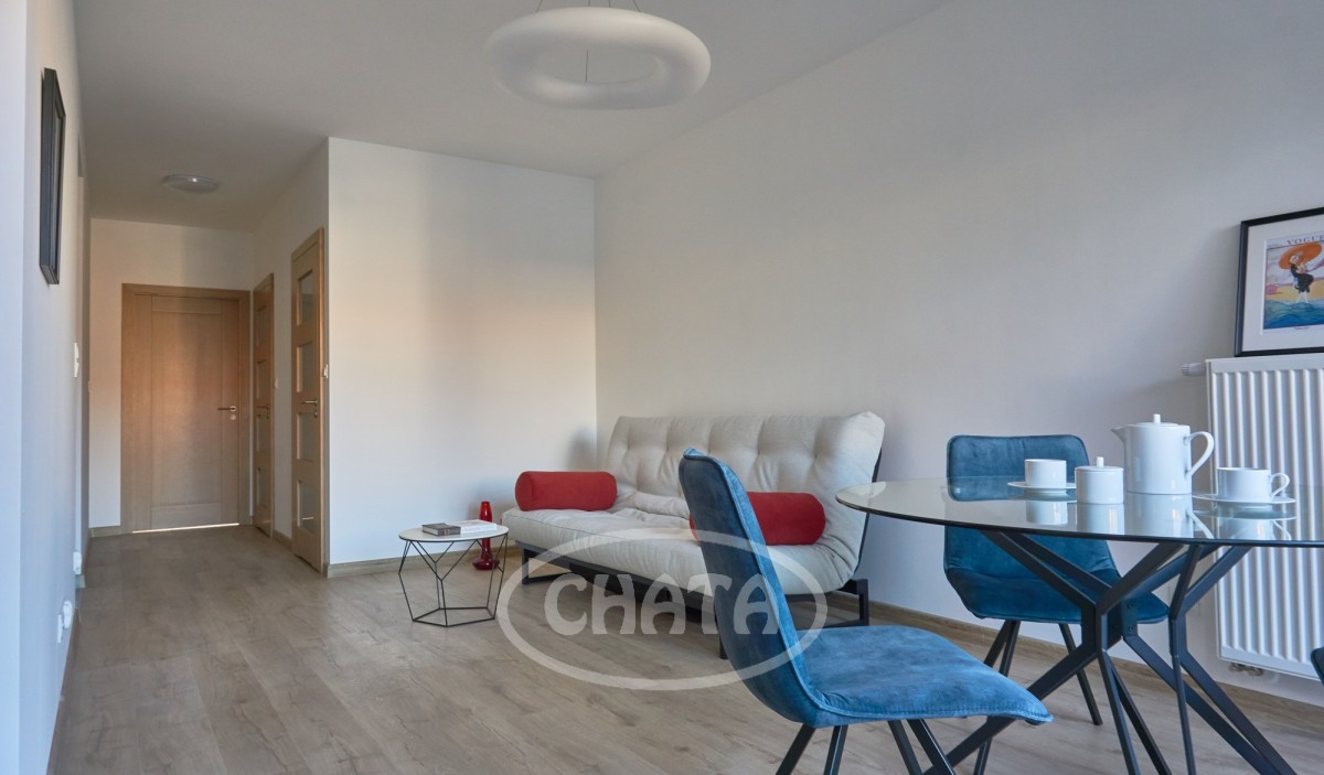 The interior is modern and functional. It is furnished with comfortable sofas and a double bed. The kitchen includes a large fridge, dishwasher, oven, induction hob, and extractor hood. The hallway has two spacious built-in wardrobes.